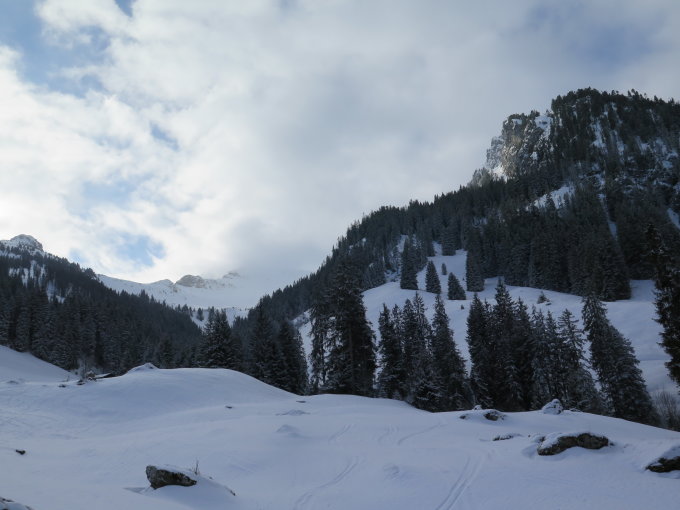 Am Sonntag wurde das Gebiet regel recht zerplügt. Aber man findet immer noch Platz für eigen Spuren. Waldweg gut eingeschneit ist aber hart und an manchen Stellen etwas eisig.