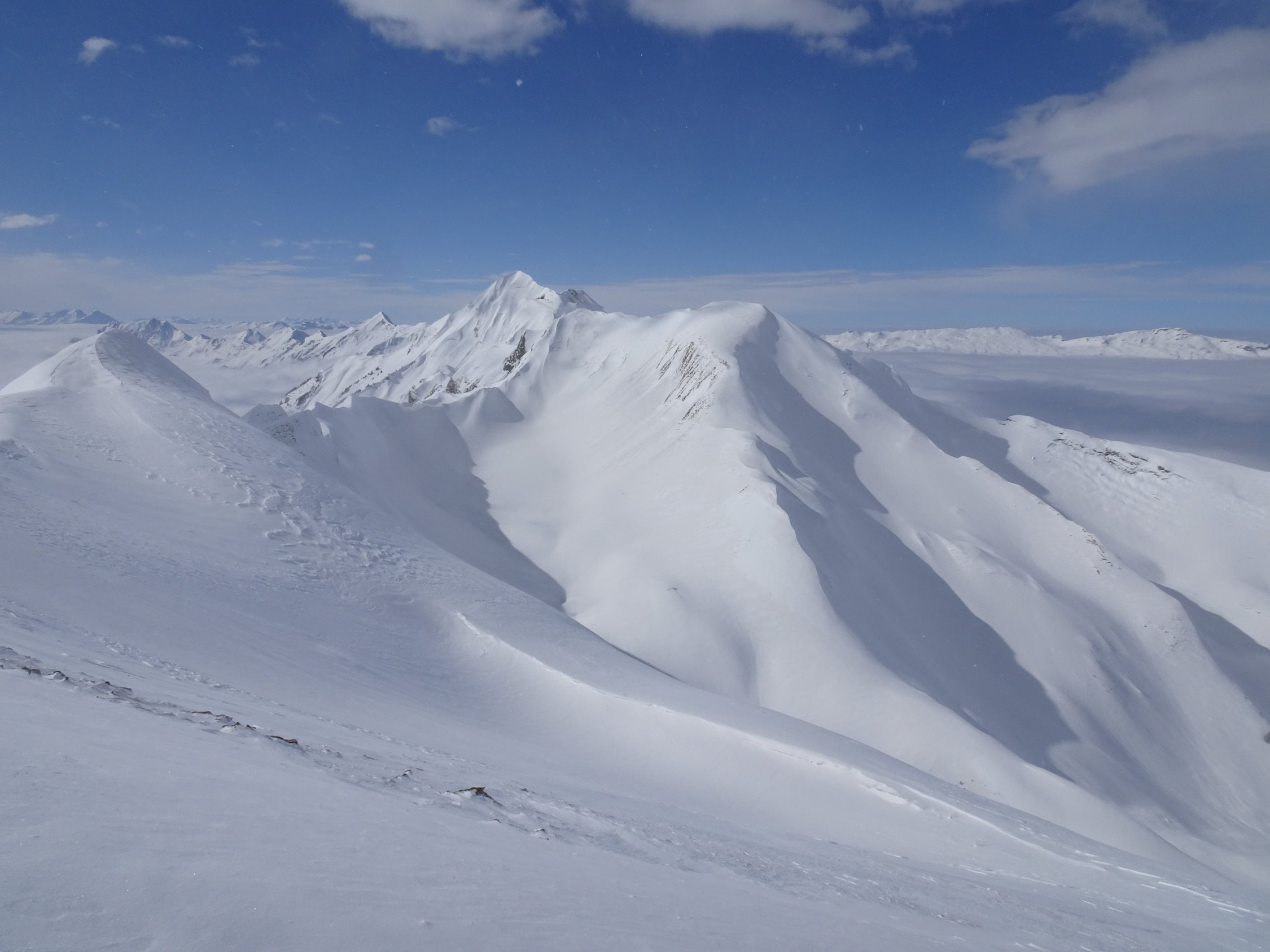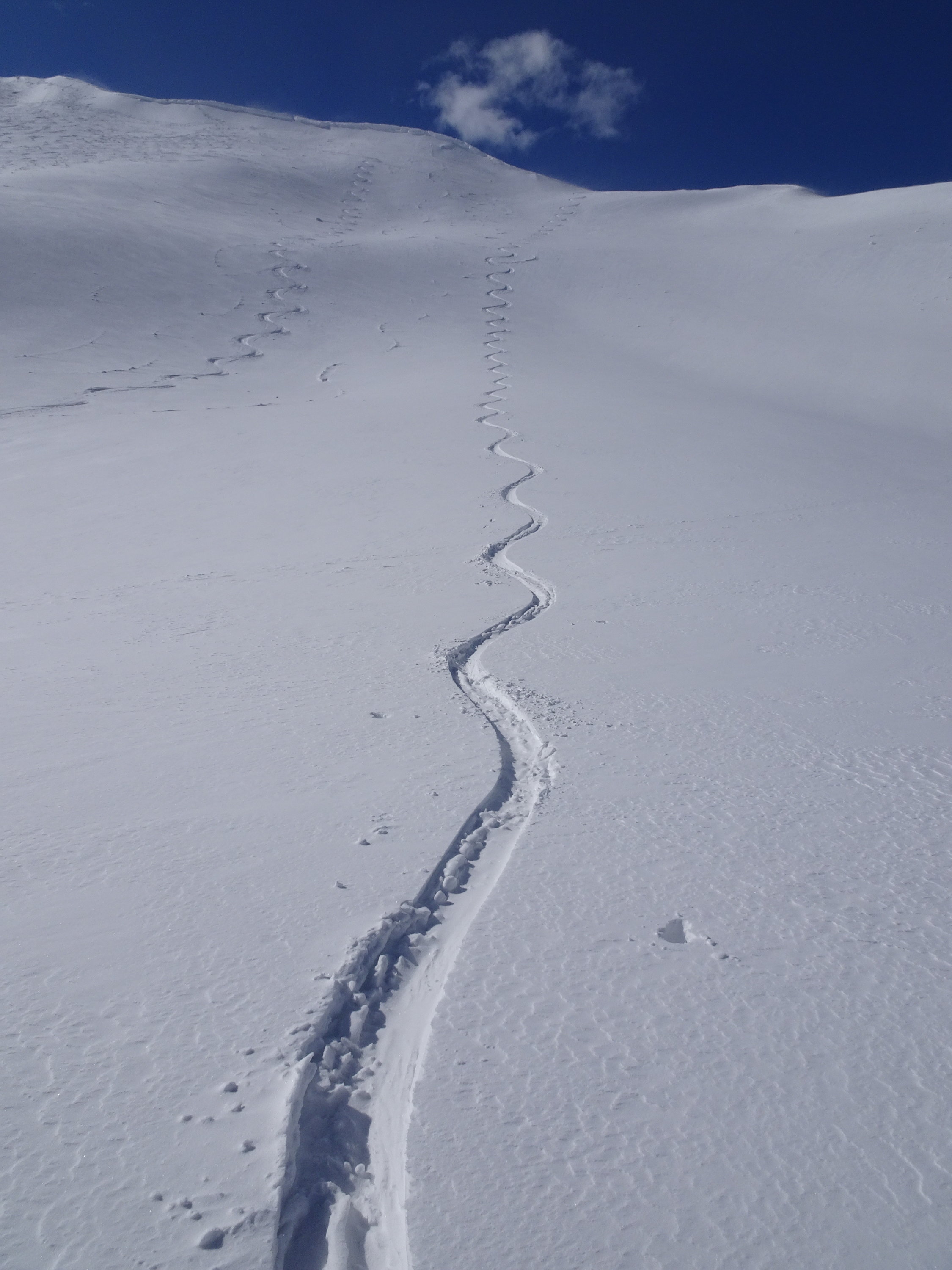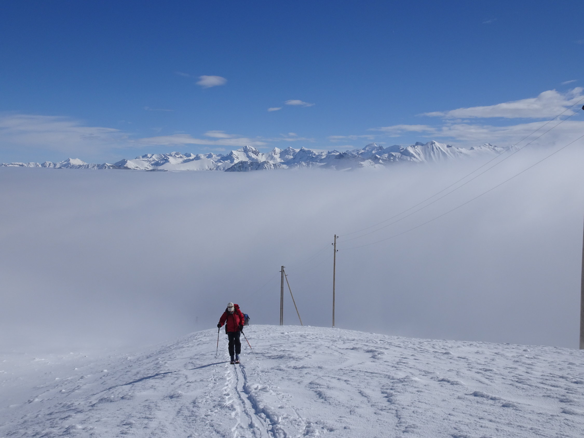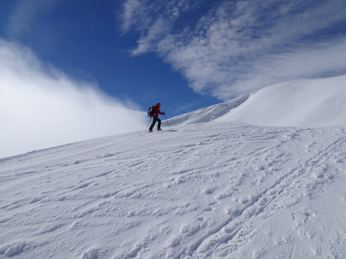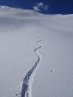 Im oberen Teil Sonne, blauer Himmel und etwas Pulver.