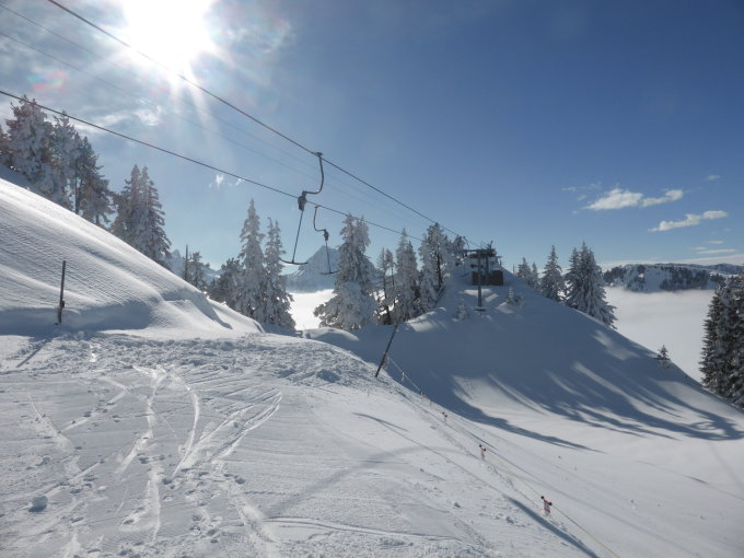 Wetter: Nebel bis ca.1750m, darüber viel Sonne und nur ab und zu leichte Bewölkung, windstill bzw. nur schwach windig, Temperatur sehr angenehm; bei der Talstation auf 988m -1Grad, an der Sonne in der Höhe +1Grad
