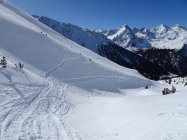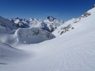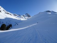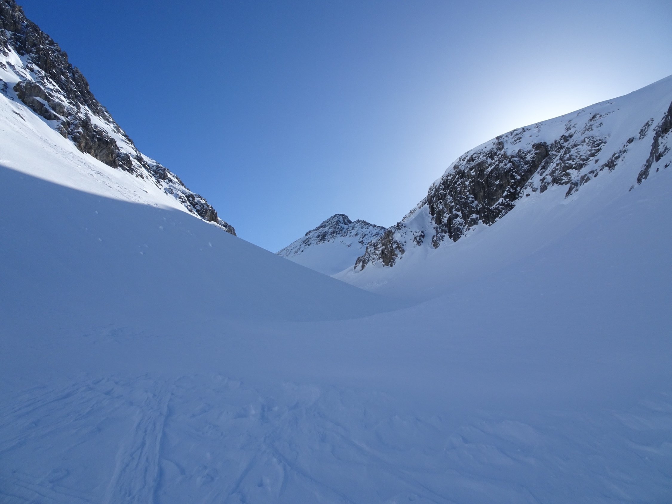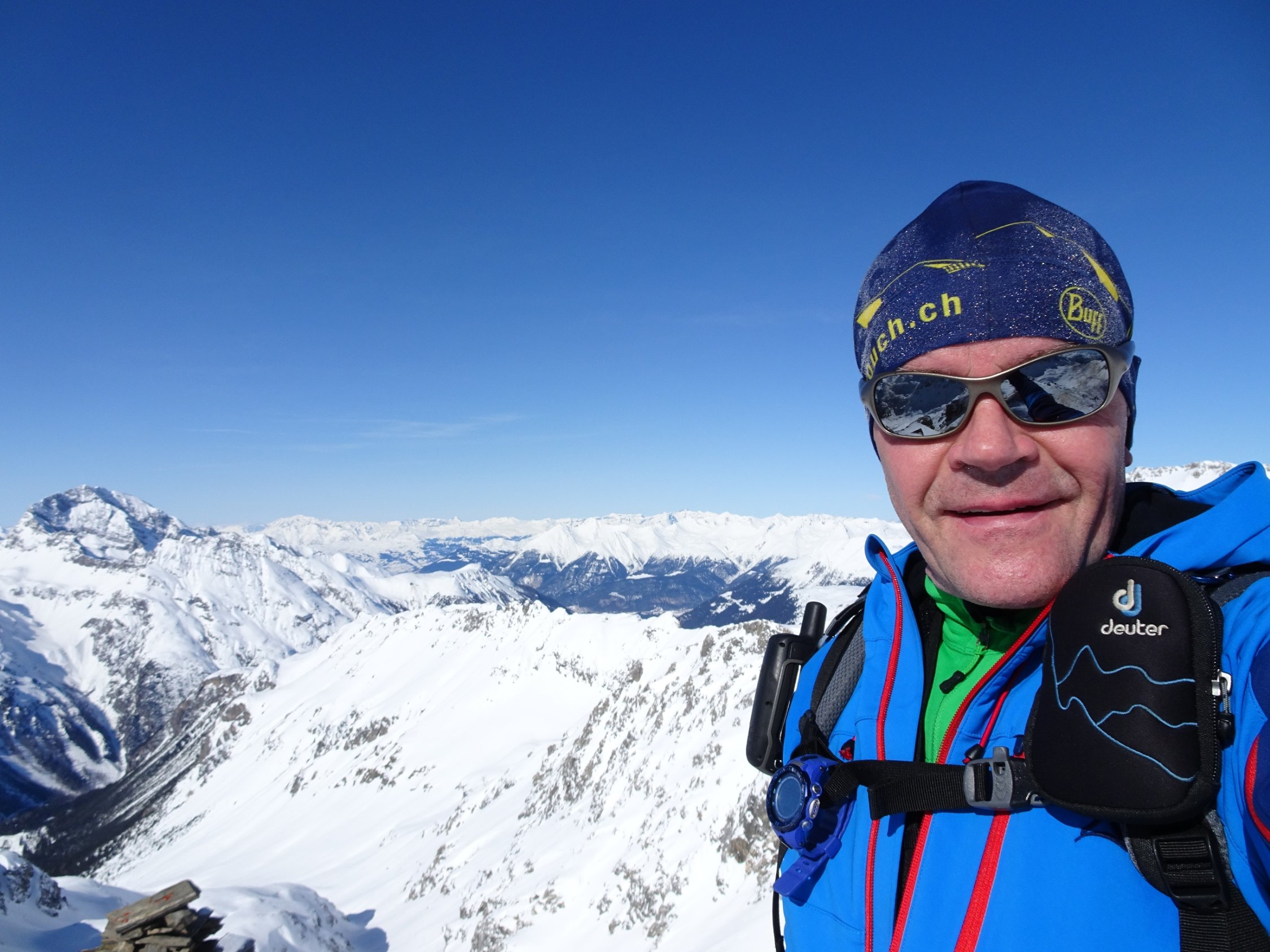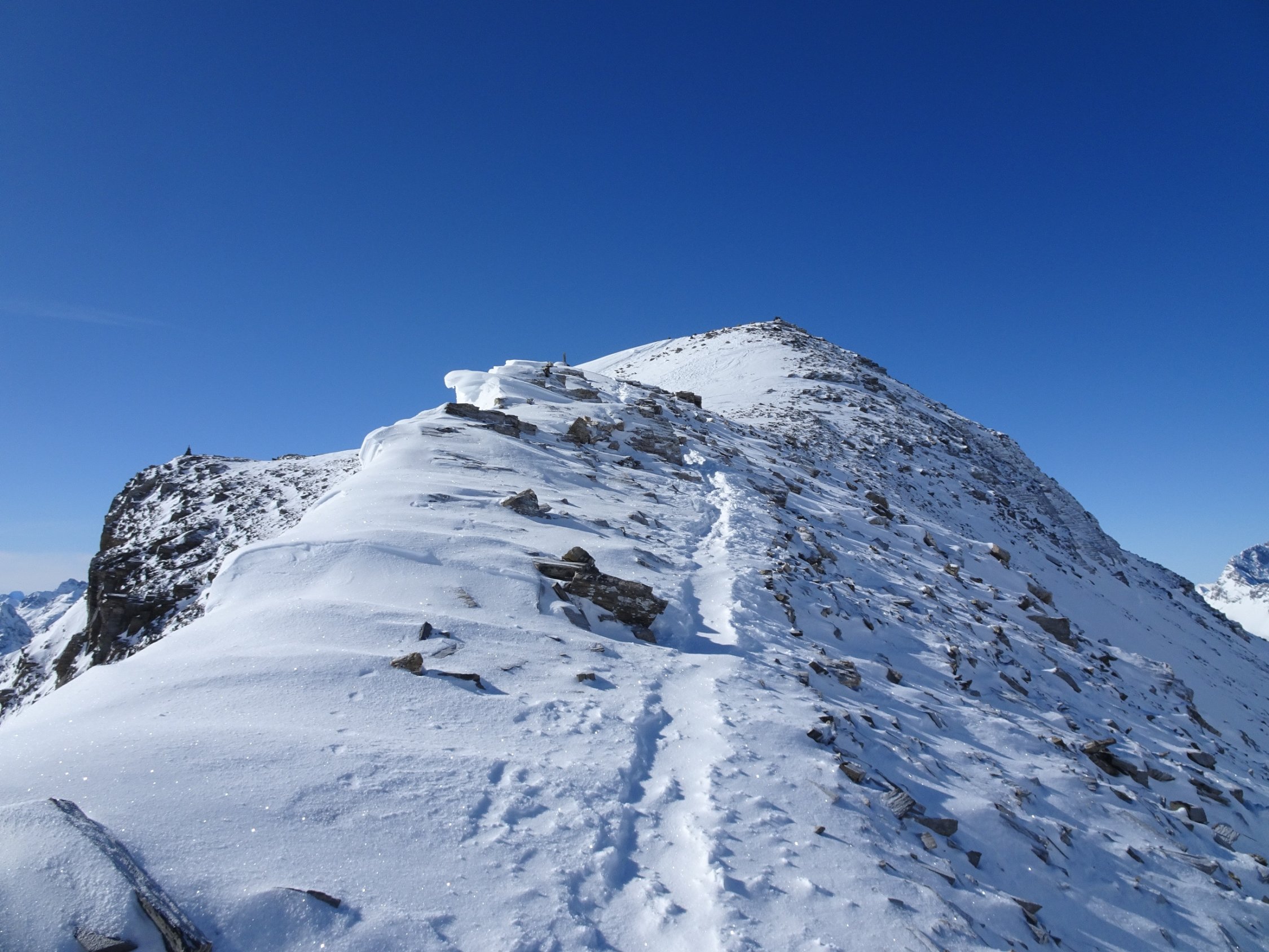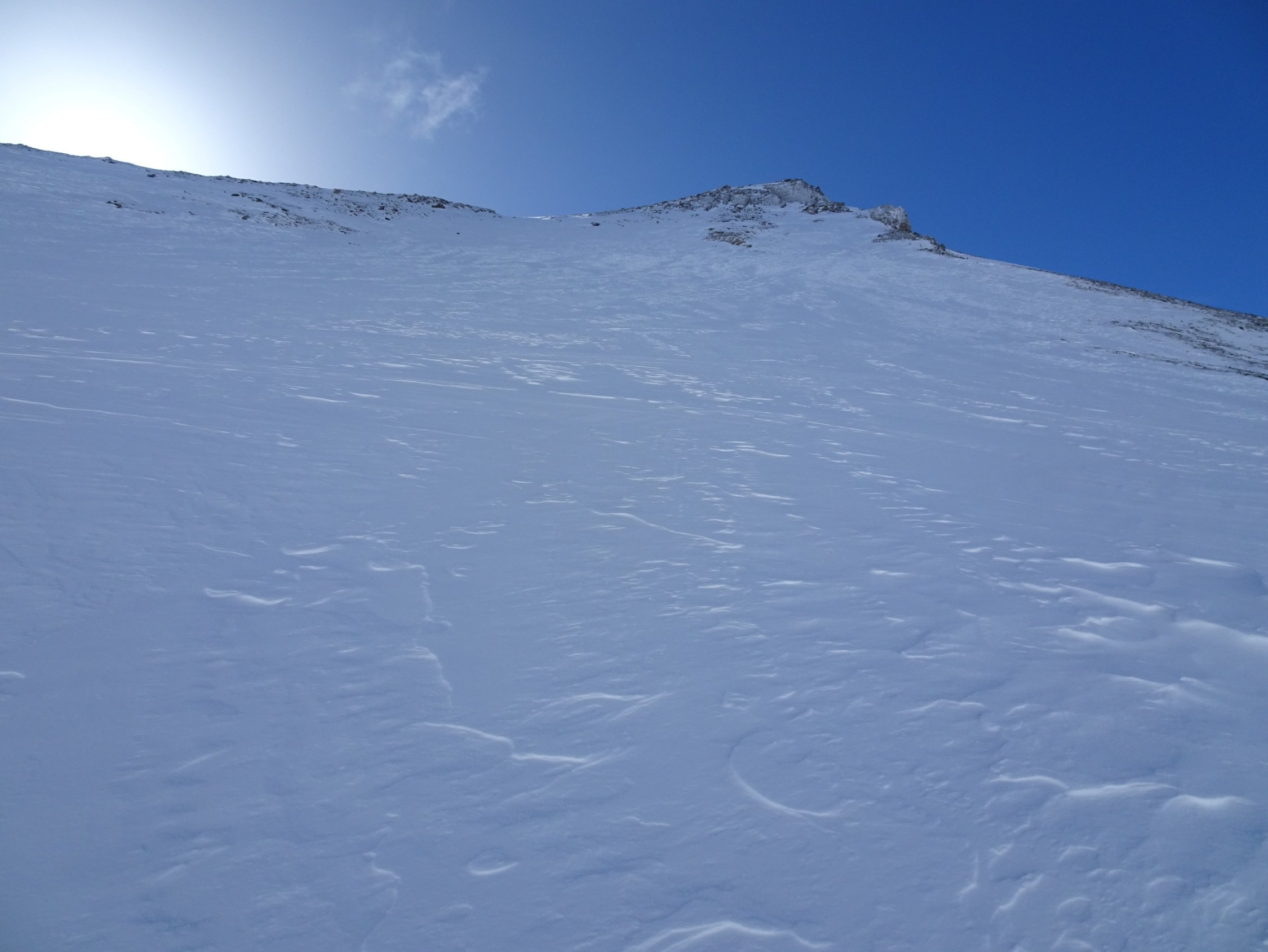 Bis auf ca. 2350 Meter gute Spur vorgefunden mit wenig Pulverauflage. Danach vom stetigen Ostwind Aufstiegspur zugeweht und kaum bis nicht mehr ersichtlich. Bis zum NE-Grat Spurarbeit in allen möglichen Schneearten; von windgepresst über Bruchharst bis zu 20cm tiefem eingeblasenem Schnee… Grat ziemlich abgeblasen und die letzten Höhenmeter ohne Hartwaren gemacht.
