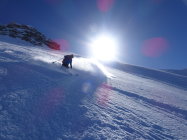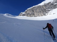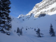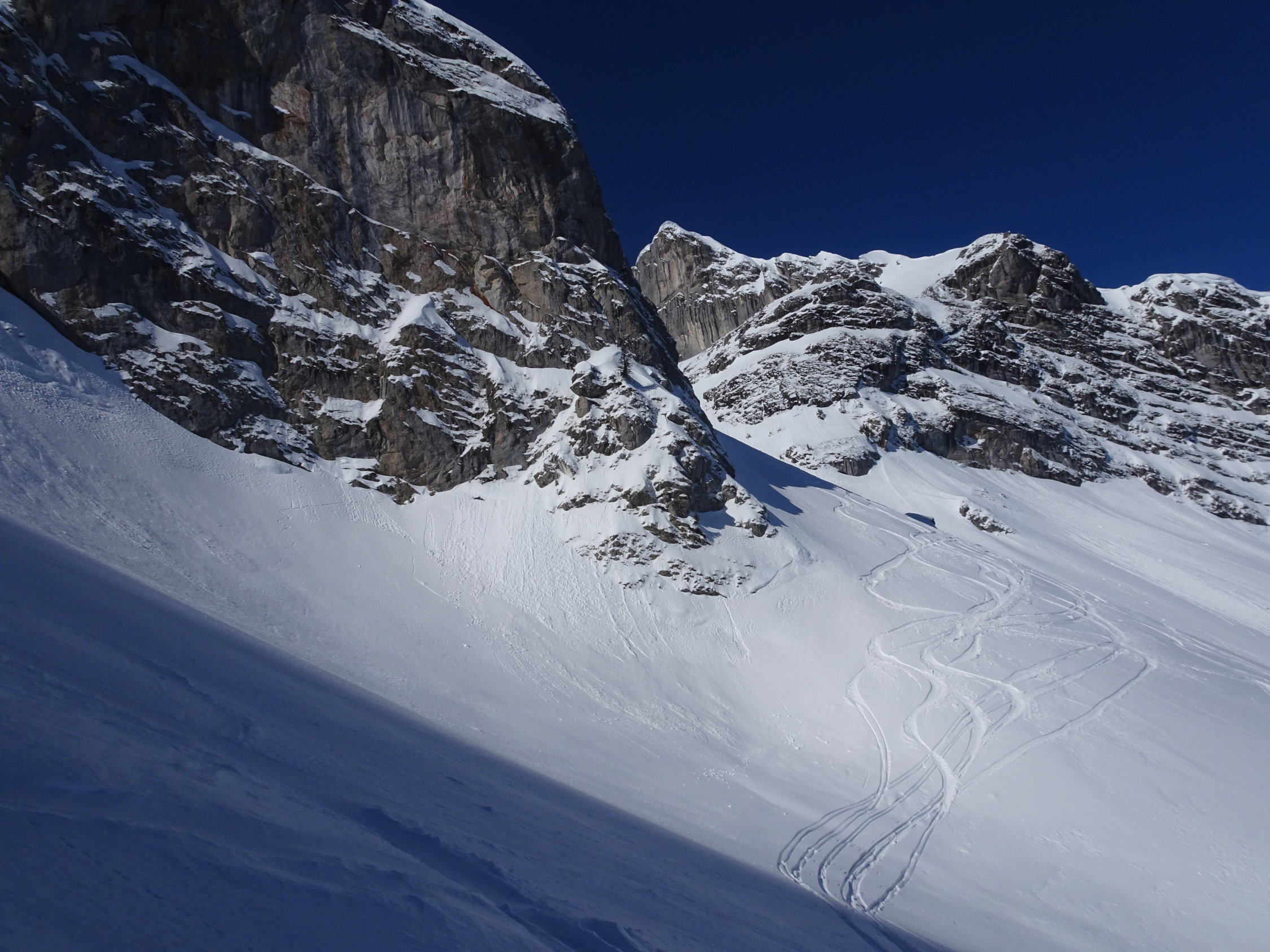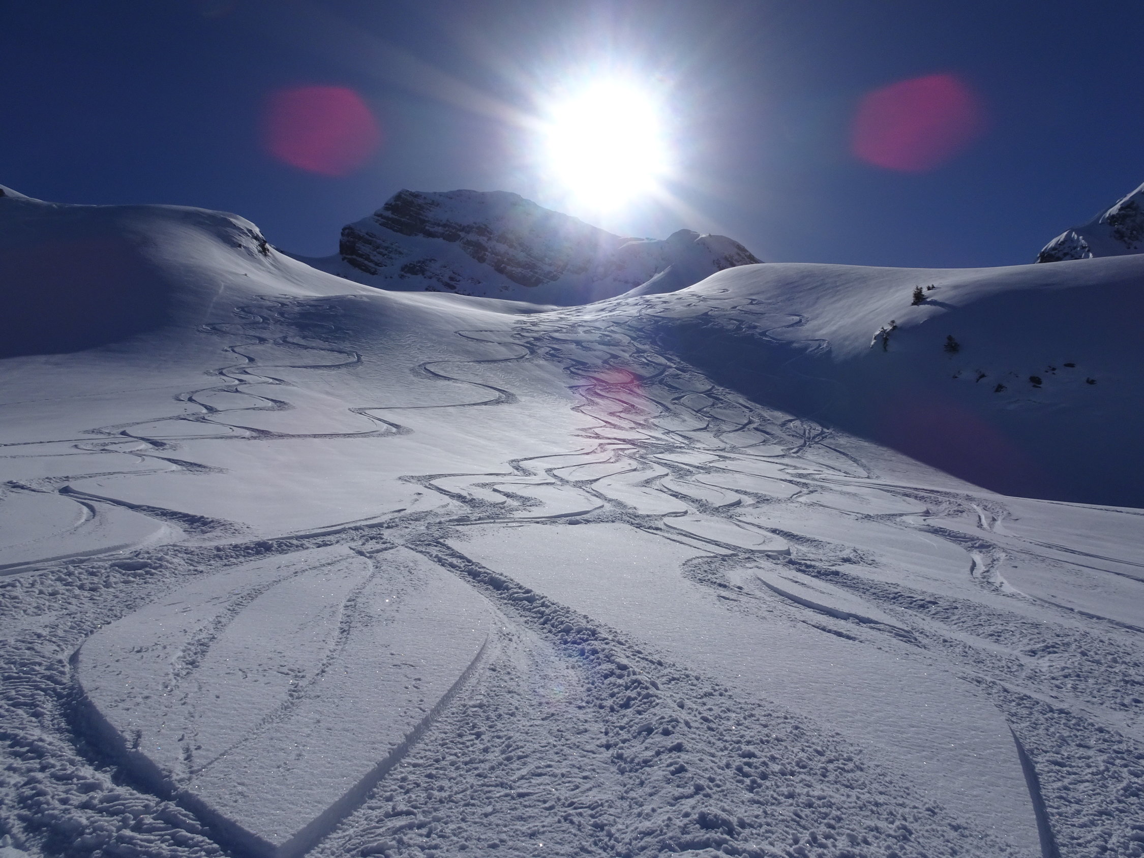 Traumhafte Schneeverhältnisse mit 10-20cm Pulver auf der ganzen Route oberhalb 1500m. Wir sind vom Rothorn in der Abfahrt noch in die Hänge der Traumlücke-Tour gequert und wir wurden nicht enttäuscht.