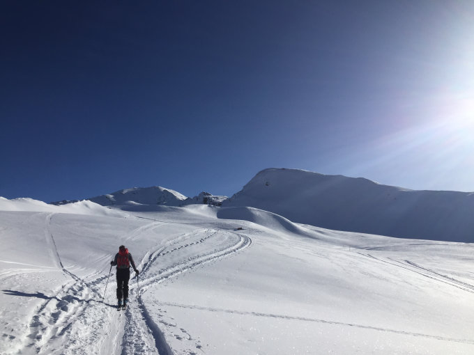 Super Wetter von beginn weg. Autobahn-spur zeugt von vielen Tourengängern der letzten Tage. Auch heute waren viele unterwegs von der Bergstation Pischa. Diverse Routen ri Klosters wurden gemacht. Wir sind über's Mattjischtäli zurück ri Flüelapass Strasse. Die hohen Temperaturen haben dem Schnee im Mattjischtäli schon kurz nach dem Gipfel Teigig werden lassen. Ganz links in Fahrtrichtung gabs noch ein paar Hänge die trotzallem schöne Schwünge zuliessen. Gegen die Passstrasse wurde der Schnee schwer und nass.