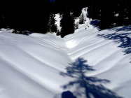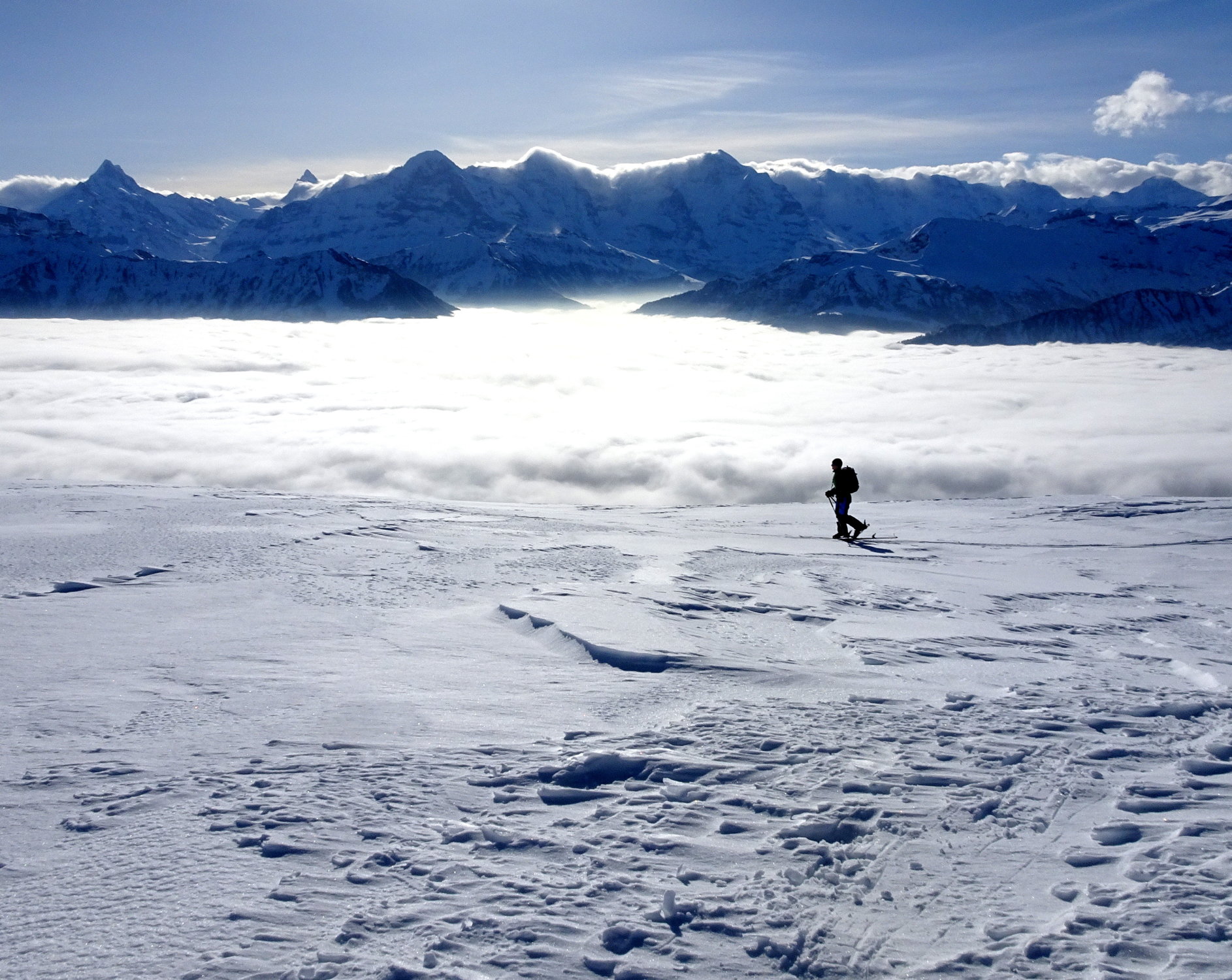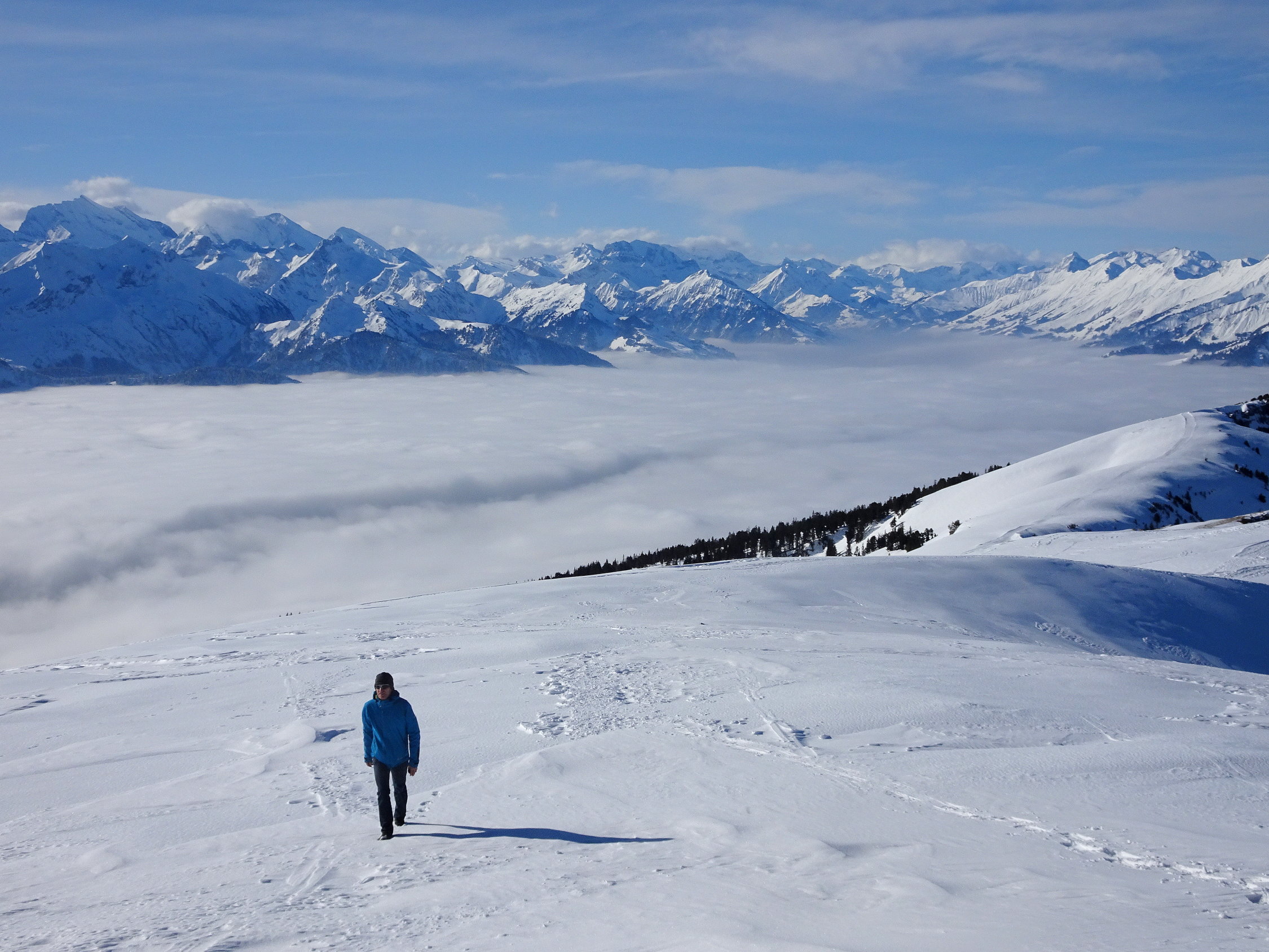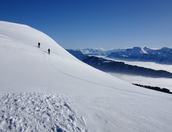 Meist tragender Schnee mit einigen, leichten Verwehungen auf dem Burgfeldstand Rücken.