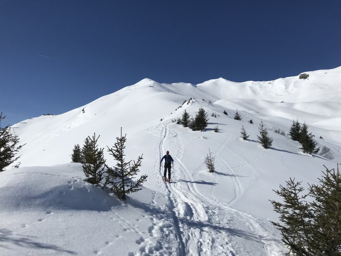 Bei der Abfahrt vom Gipfel bis hinab auf ca. 1900 m perfekte Pulverschicht von ca. 10-15 cm. Im mittleren Teil war der Schnee etwas schwer. Unterhalb 1500 m gab es am frühen Nachmittag gute Firnbedingungen.