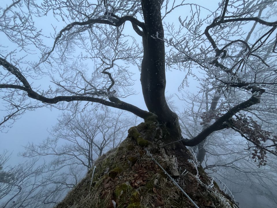 - Seilführung teilweise über bzw. durch Bäume und Wurzelbereiche, nahe am Fels anliegend.