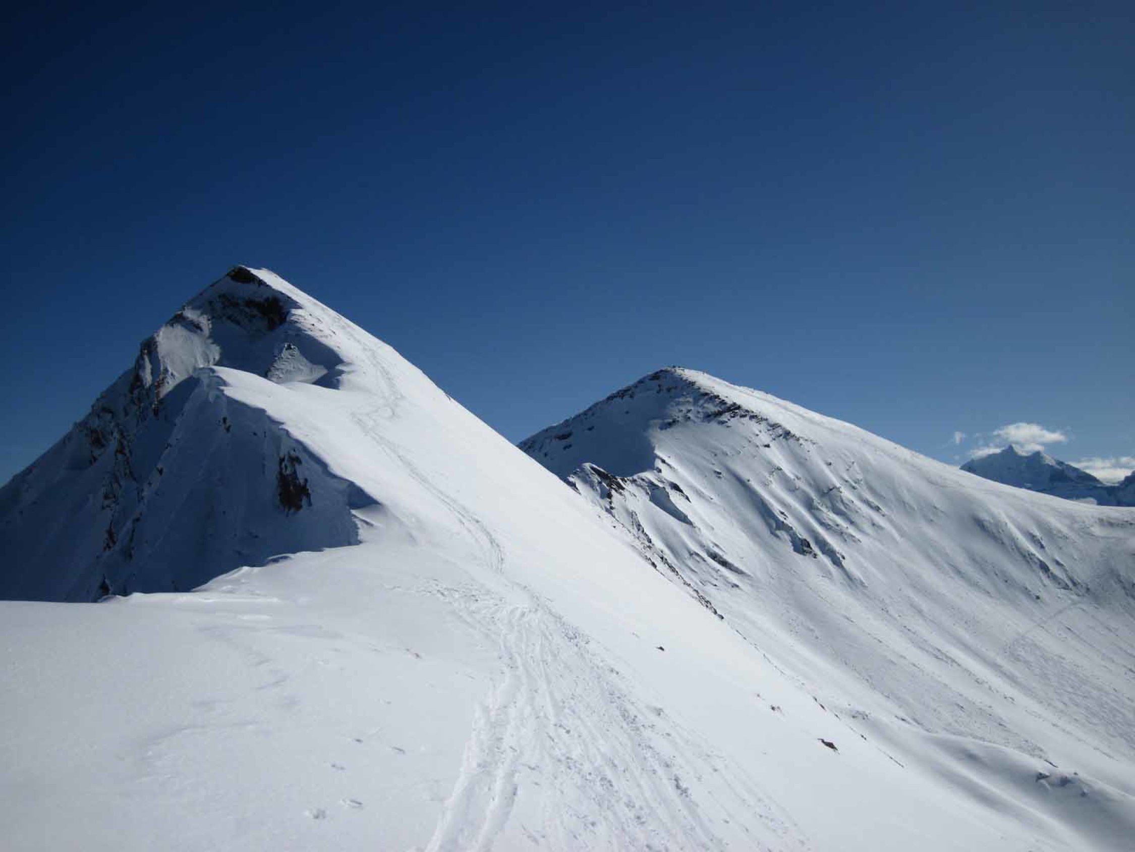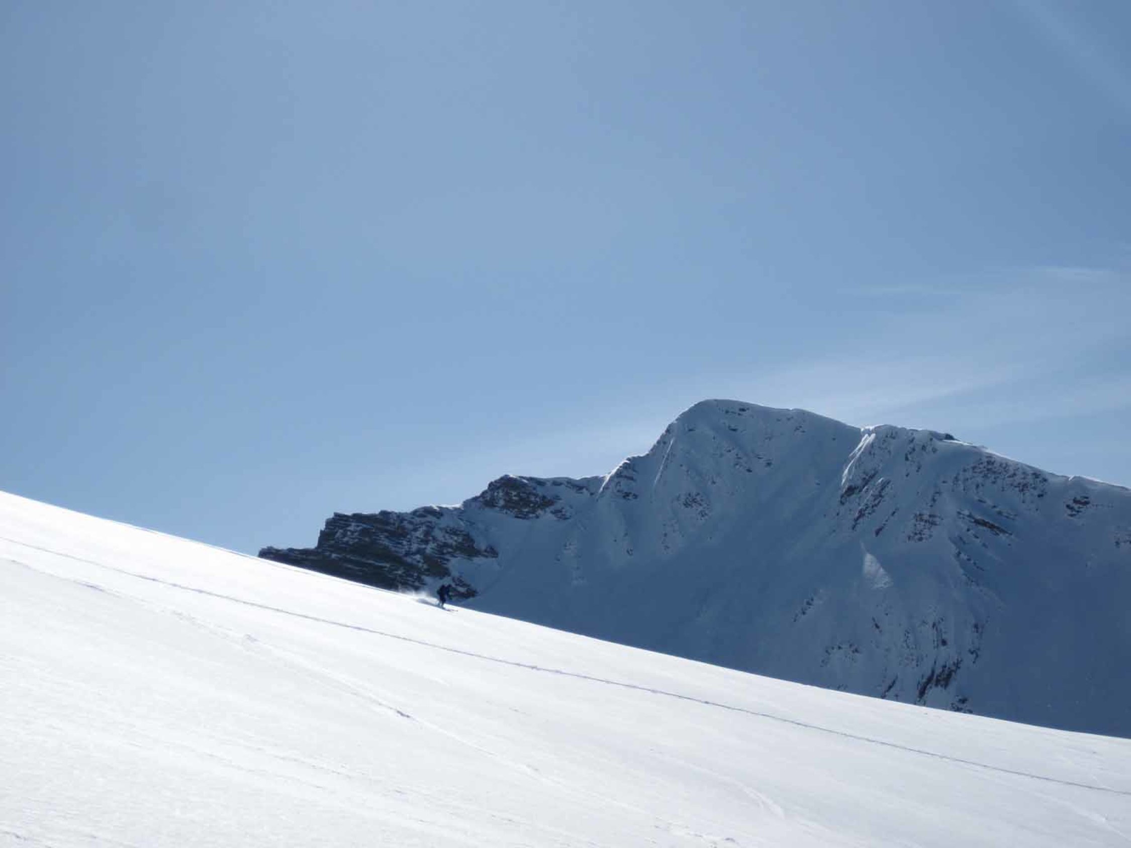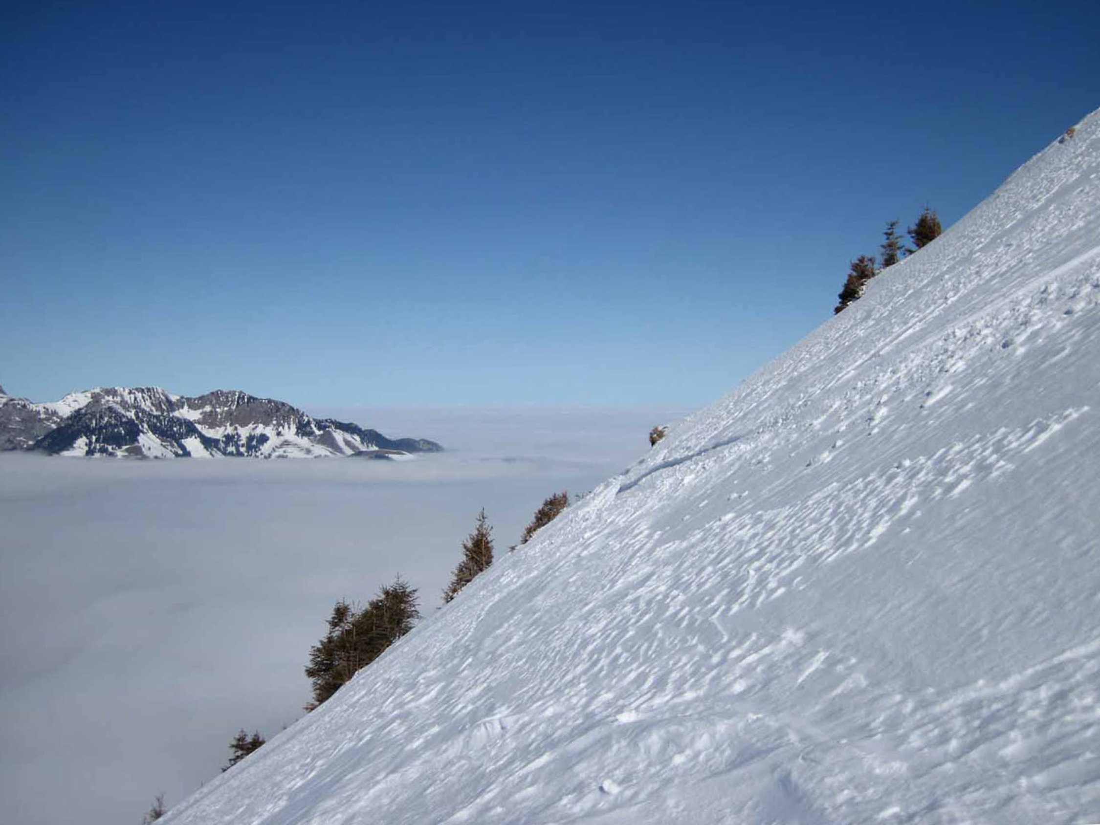Lawinen / Schneedecke: Lockerer Pulver auf tragender Harschschicht, dazwischen Schwachschicht / nicht verbunden. Sehr grosse Wächten im Gratbereich. Aufstiegsspur instabil, einige Lockerschneerutsche durch vorher Abfahrende im steilsten Teil (40°), aber von der Grösse her ungefährlich. Vorsicht aber bei Triebschneansammlungen / anderen Expositionen!