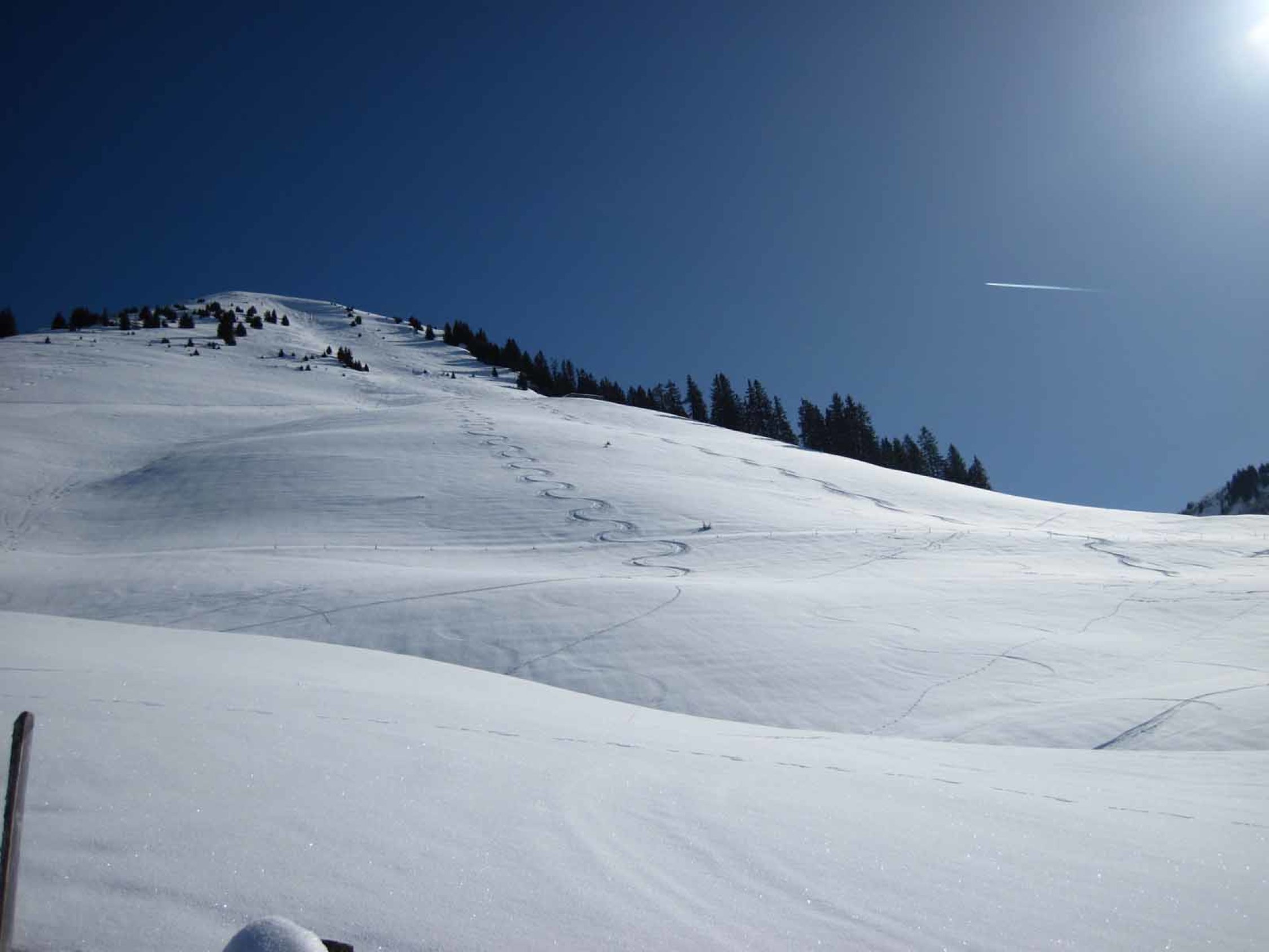 Schnee: ca. 10-30cm Pulver auf tragender, teilweise etwas ruppiger Unterlage, teilweise etwas windgepresst aber durchgängig überraschend gut bis sehr gut fahrbar, unterster Teil ein Traum. Nur für die Abfahrt hätte es ein 'hervorragend' gegeben.