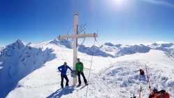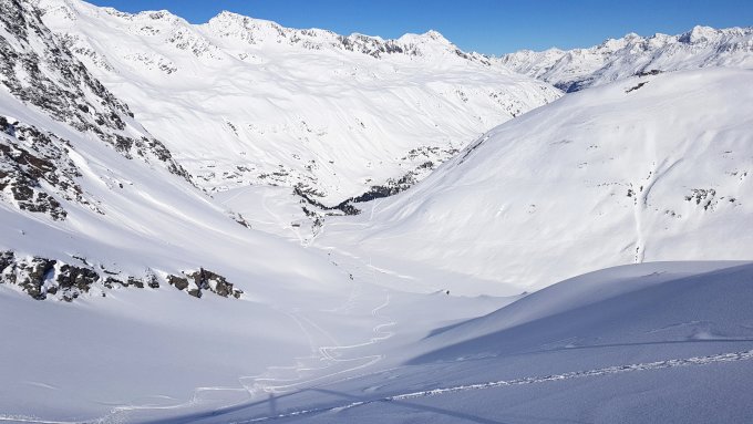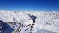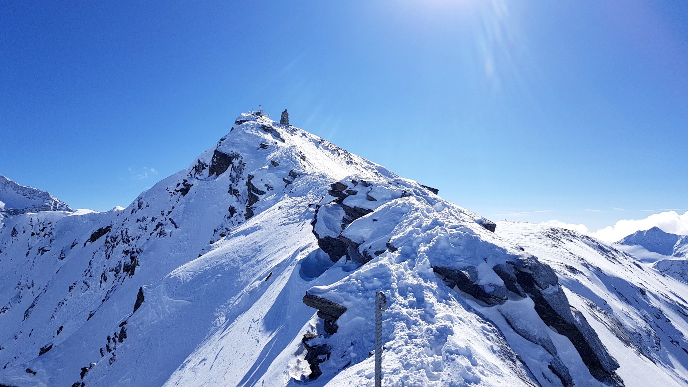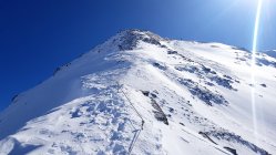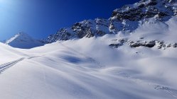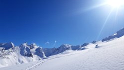 Traumhafter Pulver !! Der Steilaufschwung neben den Hangerer ist sehr gut gespurt sodas man ohne größere Probleme hochkommt. Die Seilversicherung zum Grat ist nur zur Hälfte freigelegt sodas Pickel und Steigeisen von Vorteil sind. Der Gipfelgrat an sich ist sehr gut machbar zur Zeit.