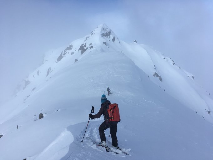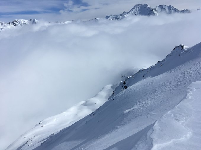 Im tiefsten Nebel hoch bis zum Gulerigen Furgga. Danach strahlend schönes Wetter. Wind nur leicht, etwas kühl. Im unteren Teil -6Grad, mitte -3Grad, oben -4Grad. Gipfel war noch ungespurt. Steigeisen nicht nötig. Abfahrt nahmen wir via NE-Flanke mit 35Grad Steilheit. Schnee auch im unteren Teil gut, jedenfalls für Snowboarder. Für Ski ist der manchmal auftrete Deckel mühsam.