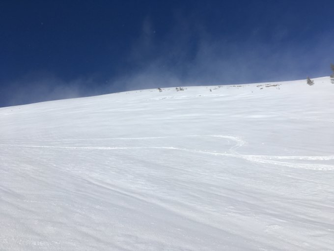 Unten recht durchgepflügter Acker, oben Hartschnee, extreme Sturmböen auf den Grat, letzte Meter abgeblasen.