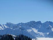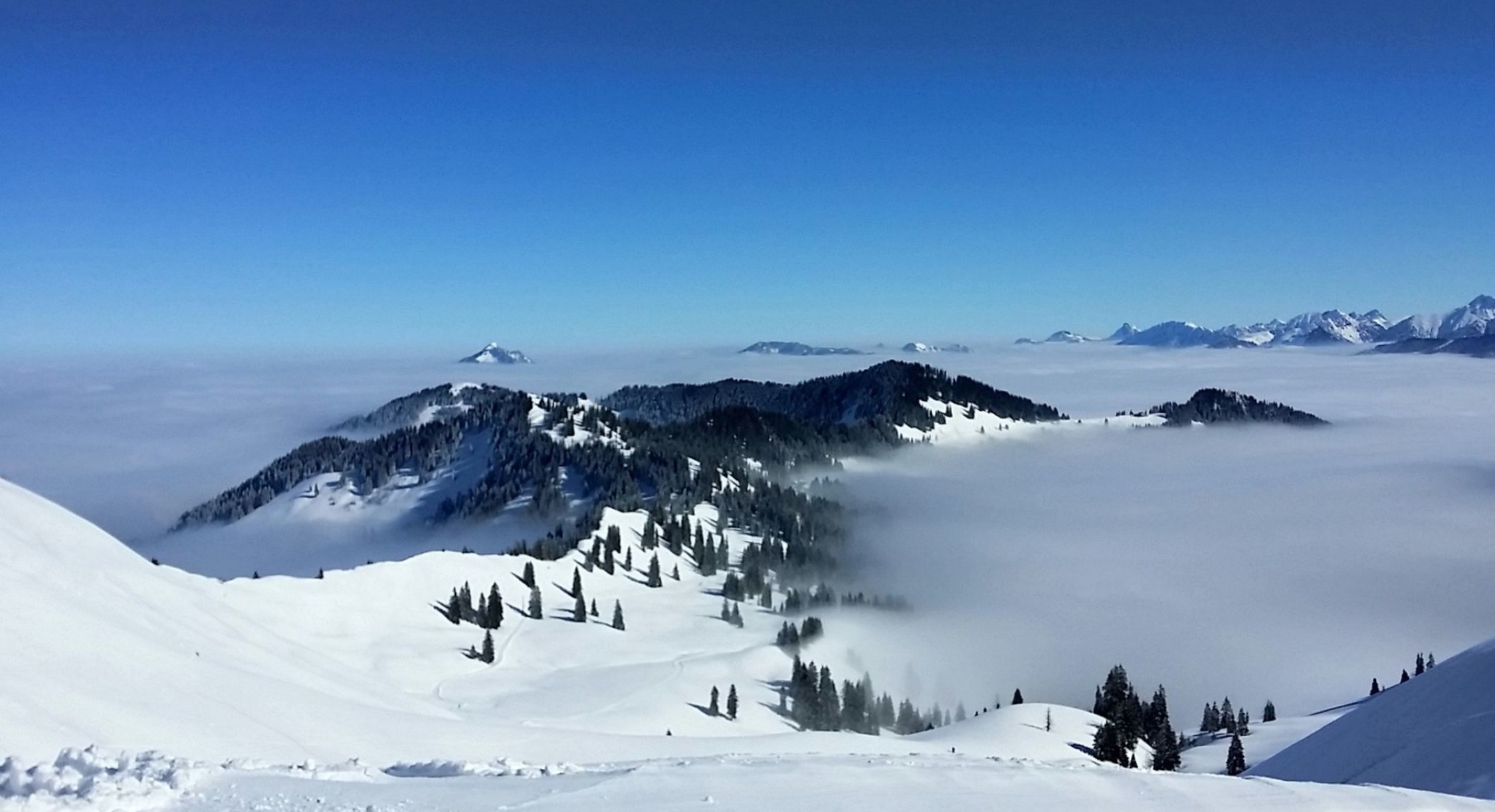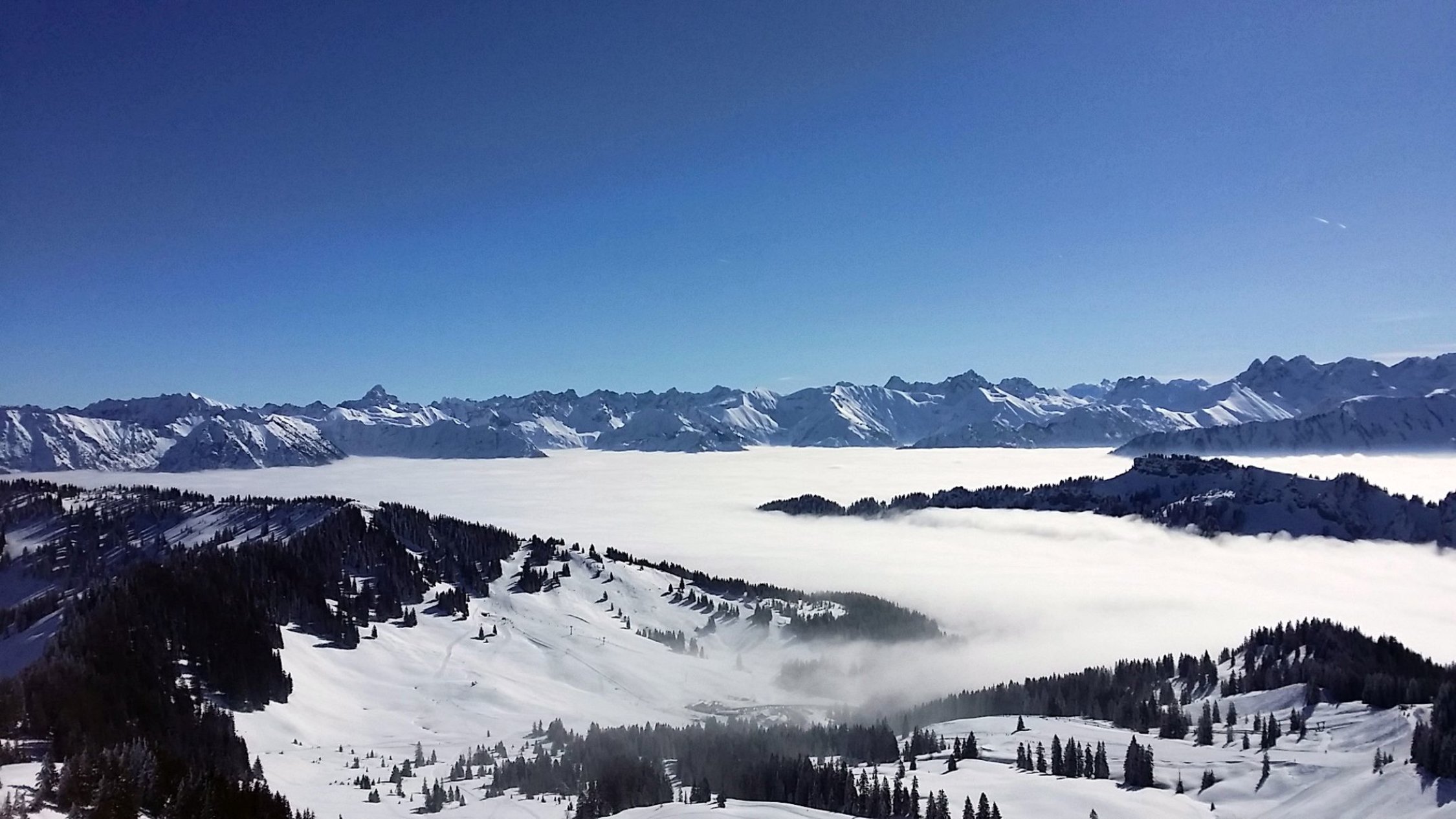 Hochnebelgrenze östlich des Riedbergpasses bei ca. 1400 m, westlich davon leicht dunstig, aber nebelfrei.