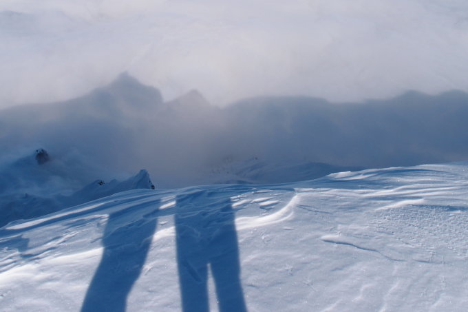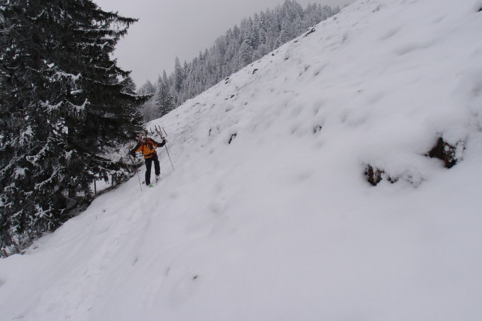 Kammnähe stark windbearbeiteter Pulverschnee, tw. hart gepresst. Schattenhänge lockerer Pulver; unterhalb 2000 m Schmelzharschdeckel; unterhalb 1500 m, wo immer Hochnebel lag, etwa 5-10 cm Pulverschneeauflage auf hartem Untergrund. Die letzten "rauhen" Hänge zur Stöckalp sind eher Skimassage als fahrbar.