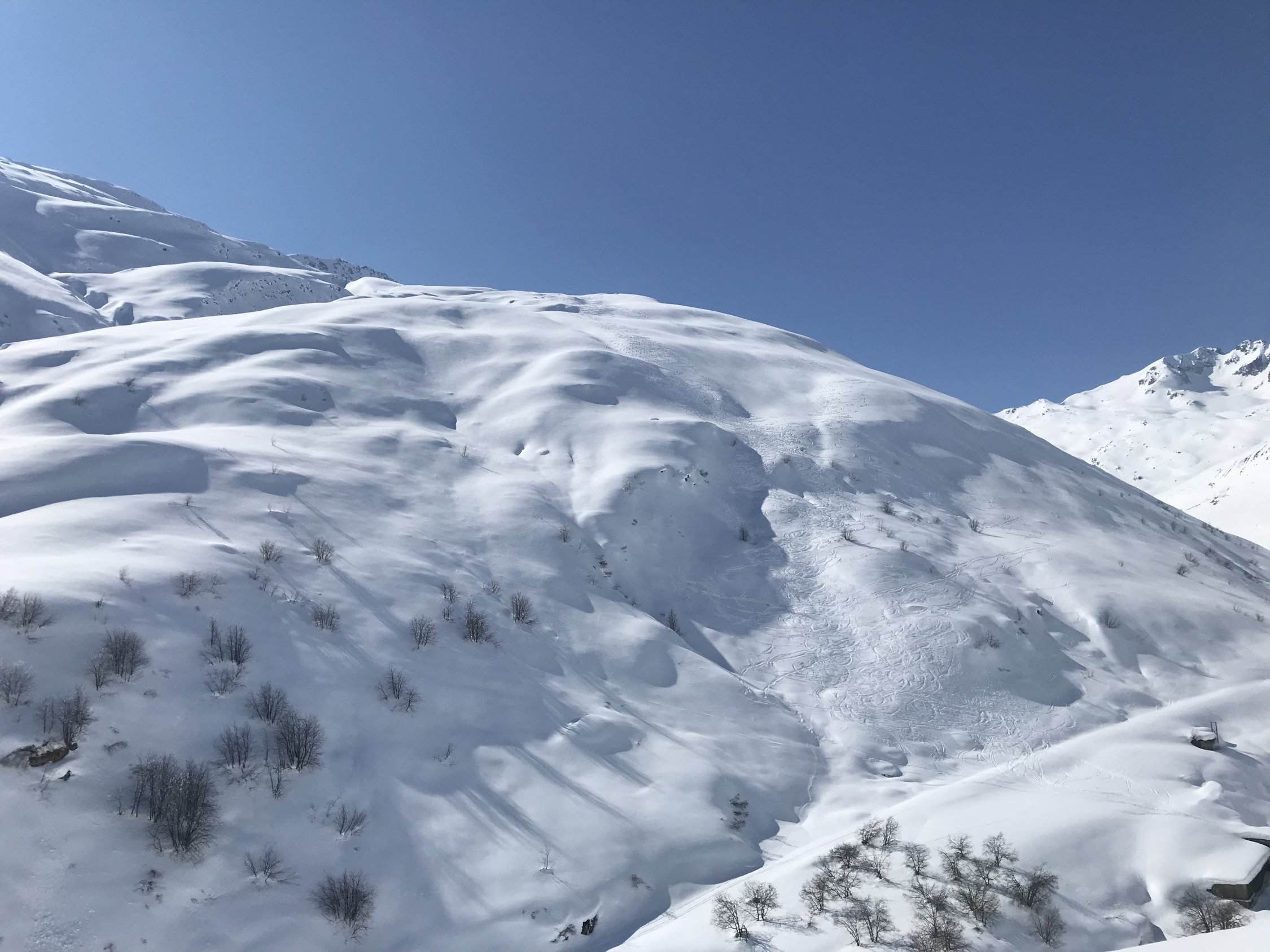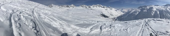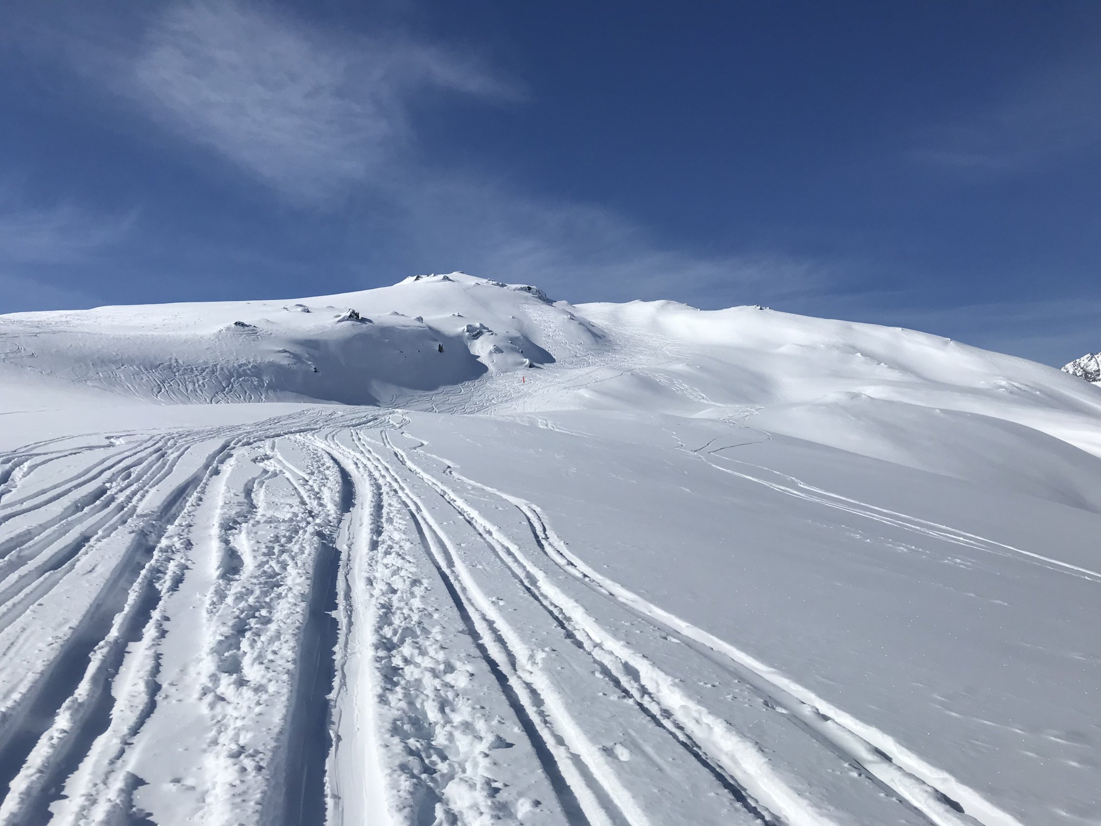 Nordabfahrt im oberen Teil ca. 10-15cm Pulver auf harter Unterlage, sehr schön zu fahren / schwingen. Im unteren Teil Richtung Brücke dann recht verfahren und hart gefroren, ähnlich wie ein Lawinenkegel.
