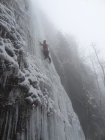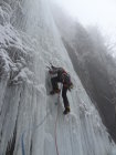 1. Sl, 50 m, WI4: Über die Wandstufe in ca. 80° steilem, kompaktem Eis empor. Oben flacher nach links zu einem massiven Baum (bequemer Standplatz).