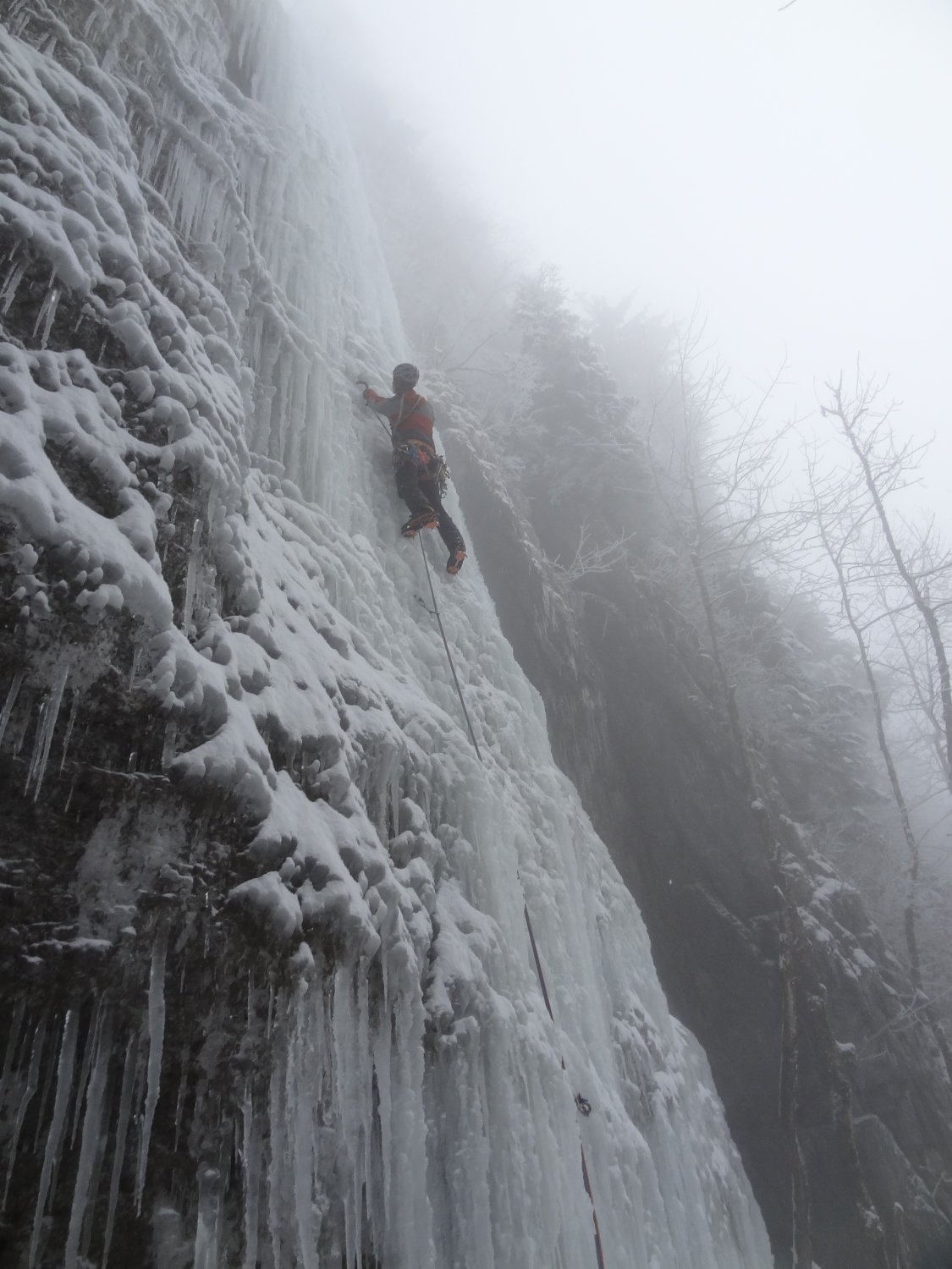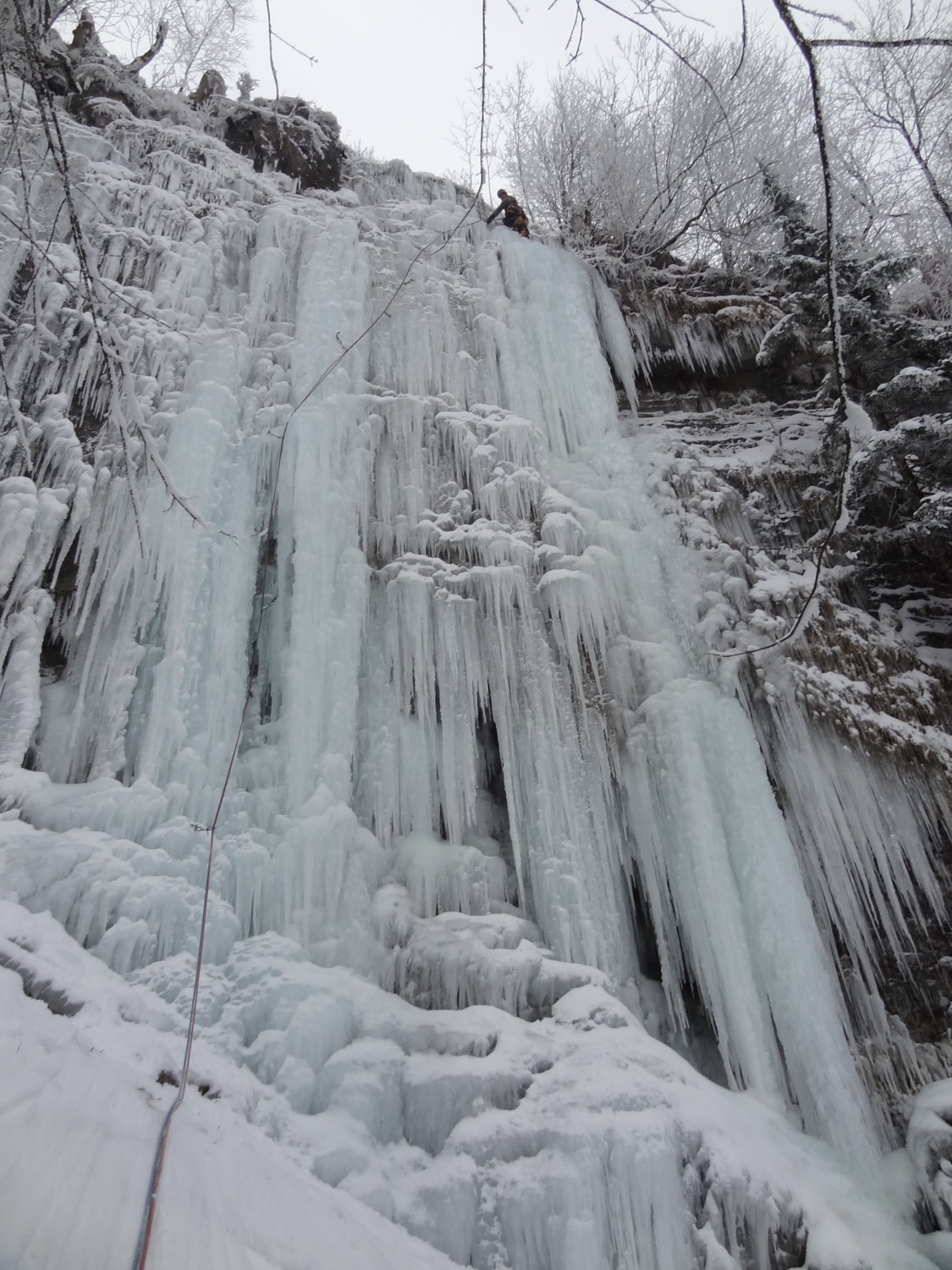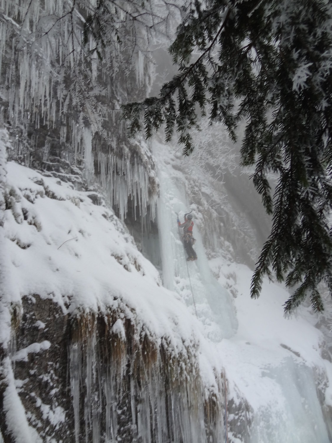 Wir sind den Eisfall gemäss der obigen Beschreibung in drei Seillängen geklettert. Sehr solide Bäume bieten sich als bequeme Standplätze an.