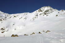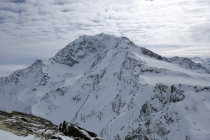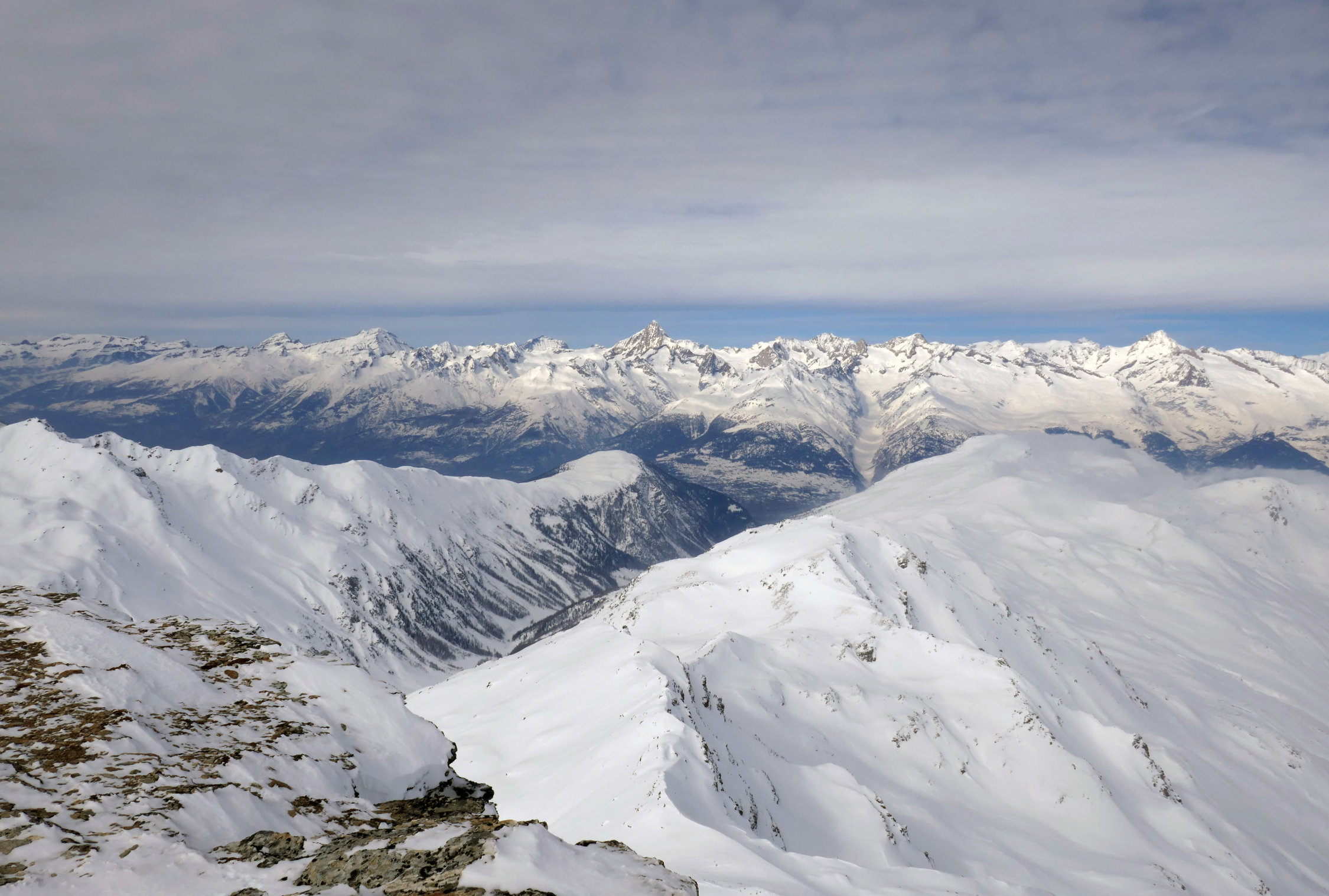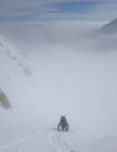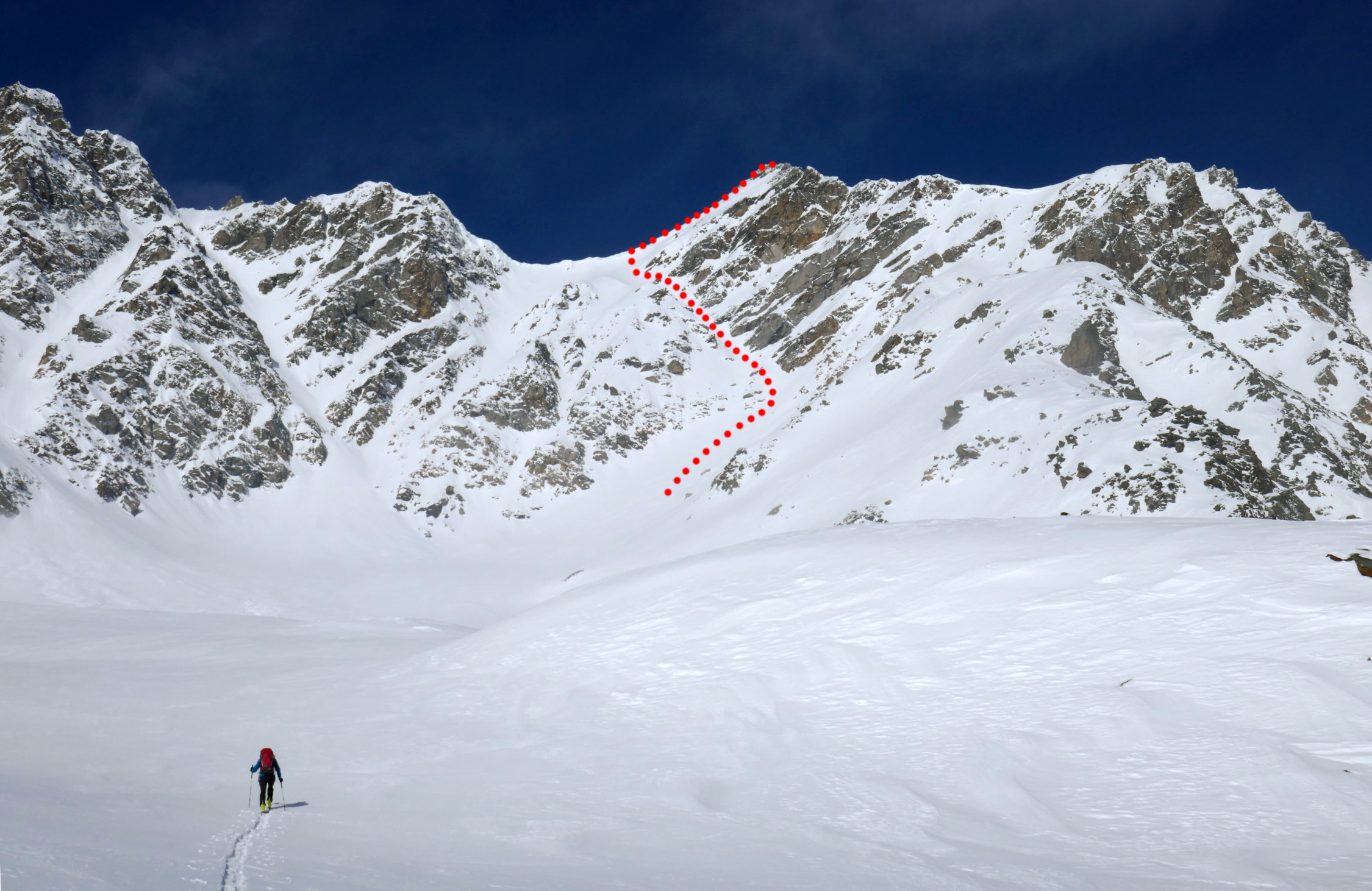 Auf der ganzen Tour Pulverschnee, z.T. etwas harstig. Im Couloir Skis im Aufstieg aufgebunden (zu steil für Spitzkehren). Abfahrt durchs Couloir gut. Südflanke am Gipfel gut eingeschneit: mit den Skis bis zum Gipfel.