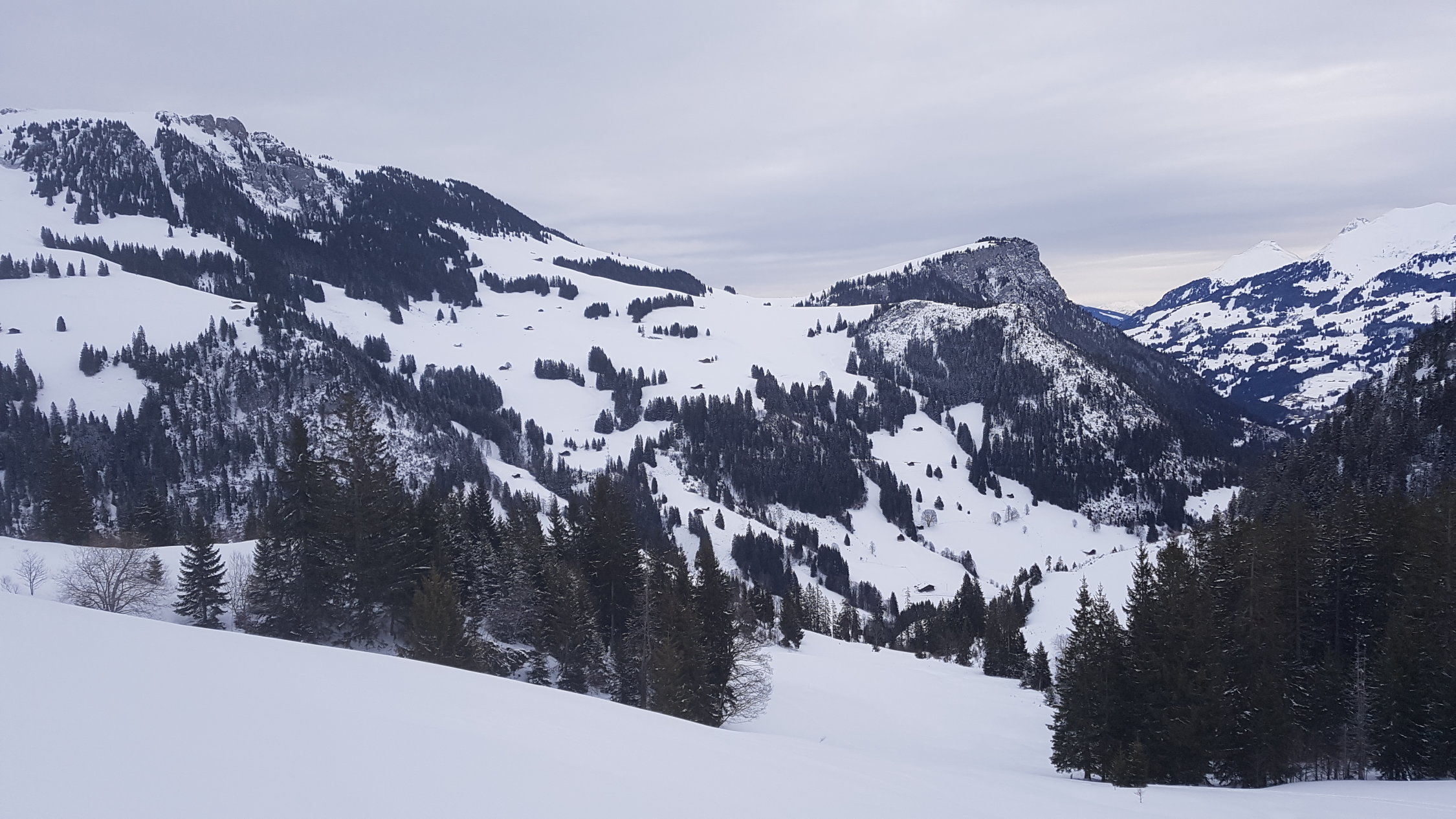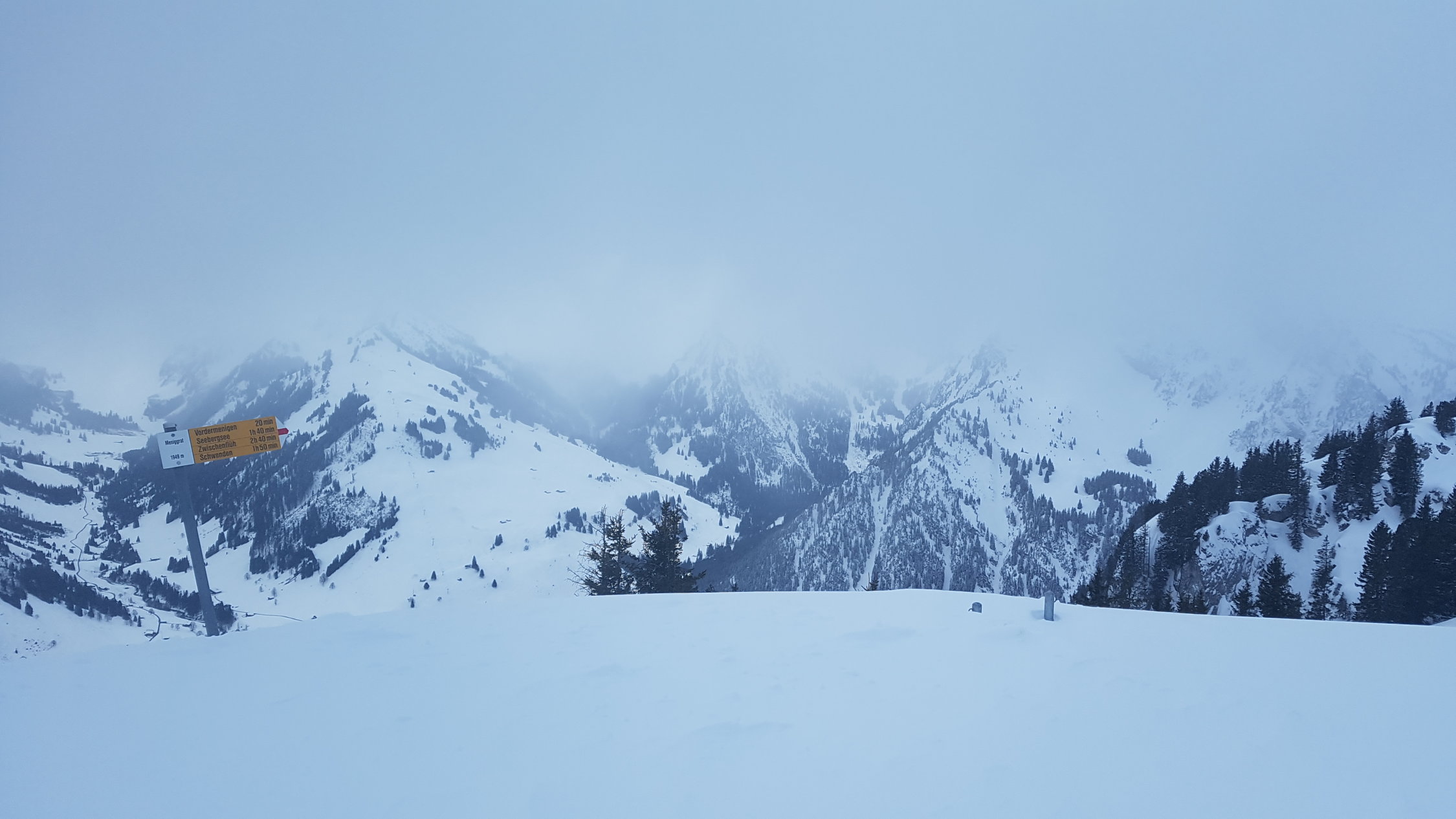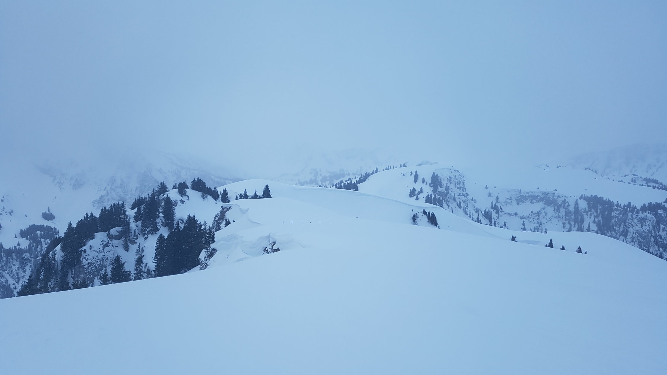 Wetter: Bedeckt. Auf Gipfel von Westen einsetzender leichter Schneefall. Bei der Abfahr dann aber schon weider blaue Löcher in der Wolkendecke.