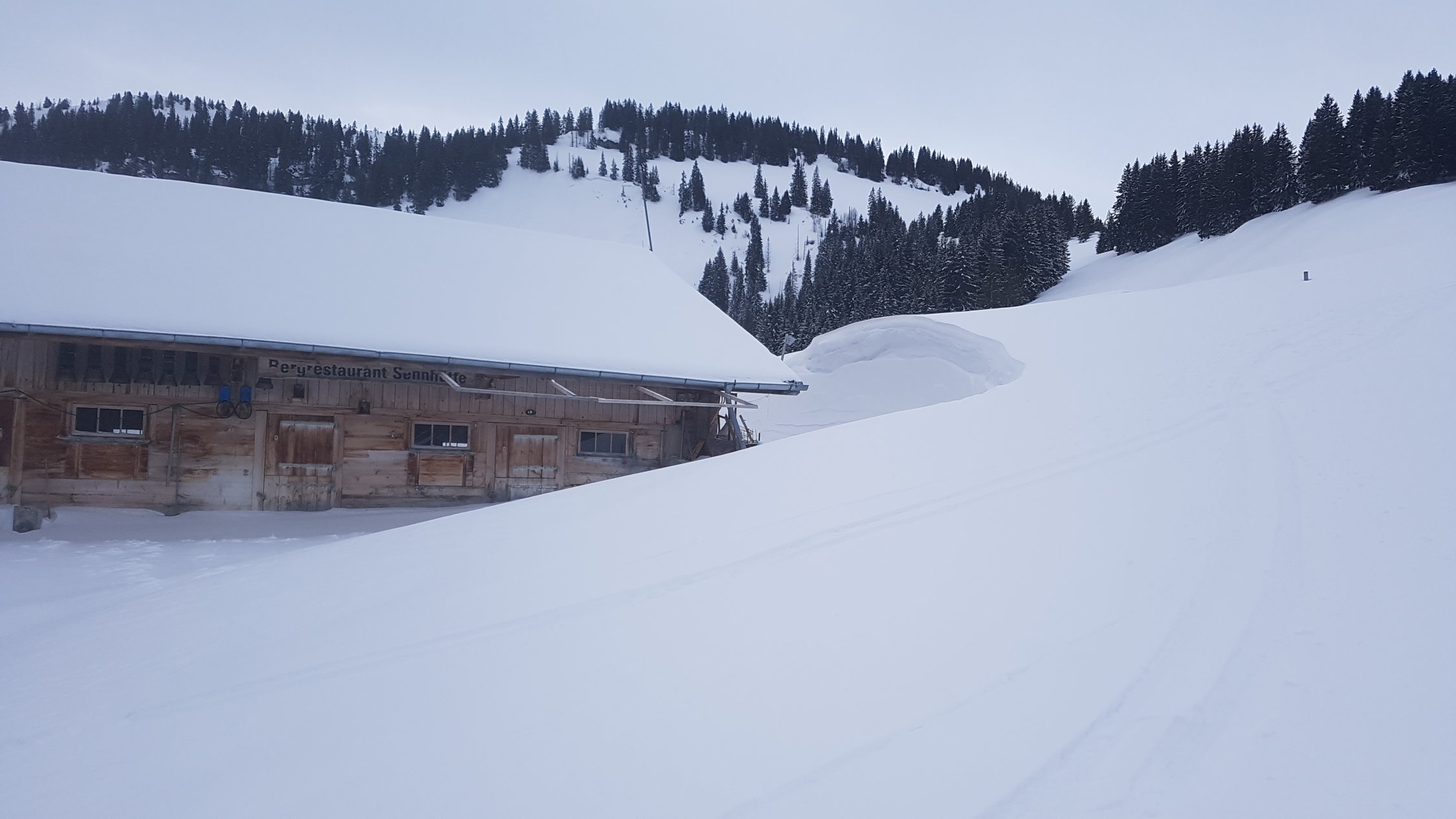 Beim Parkplatz ca. 20 cm Pulverschnee mit dünnem Deckel.
