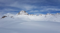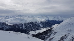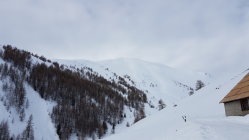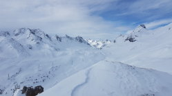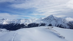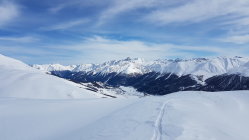 Abfahrt: Nicht mehr wirklich Pulverschnee. Wechselnde Verhältnisse von leichtem bis gedeckeltem Schnee. Unterhalb der Alp Es-cha Dadour dann schwierigere Verhältnisse. Ab P1960 kann man auch den Schlittelweg benutzen.