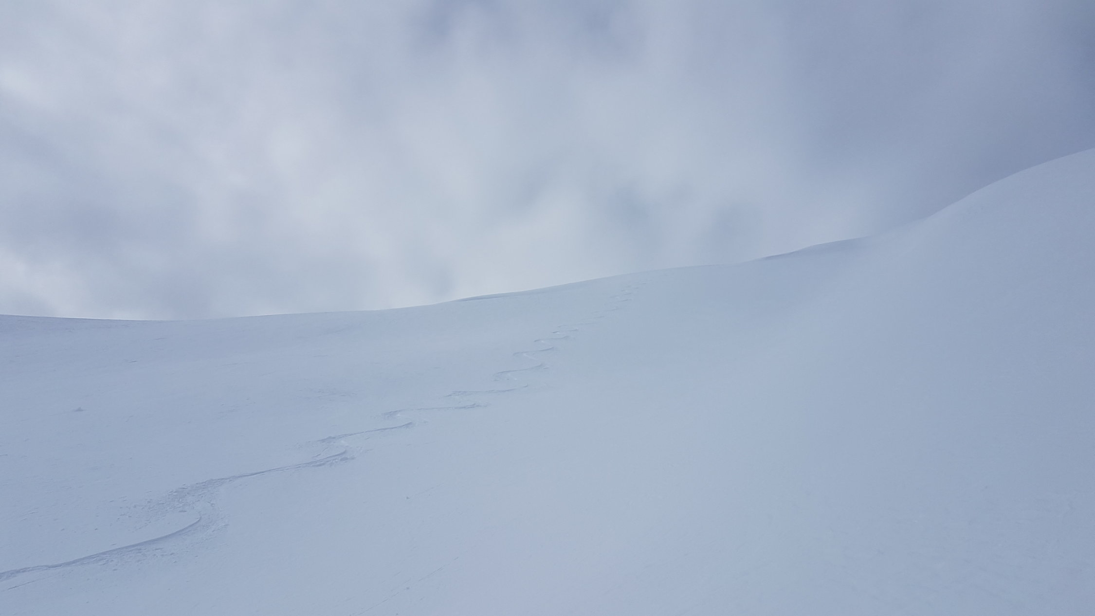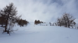 Licht war etwas diffus. Aufstieg ohne grosse Probleme, war gespurt bis oberhalb des Waldes. Oberhalb des Waldes zum Teil etwas abgeblasen, Spur konnte aber problemlos gelegt werden.