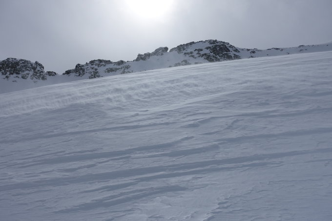 Heute morgen dachte ich noch, dass ich bei Sonne den Gipfel erreichen kann, das hat leider nicht geklappt. Ich war heute alleine auf der Route unterwegs. Das Spuren des Couloirs war ganz schön mühsam. Der Bruchharsch wurde nur von einzelnen Triebschneepaketen abgelöst, abfahrtstechnisch war dies heute kein Highlight. Vor allem die schlechte Sicht trug ihr übriges dazu bei. Ganztags starker bis stürmischer Wind.