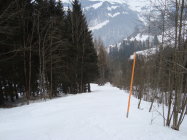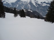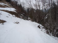 Der erste Wiesenhang und die schmale Engstelle weisen erste Grasinseln auf. Dies sind jedoch im Aufstieg sowieso und auch in der Abfahrt mit Kurzschwingen noch problemlos umfahrbar.