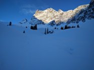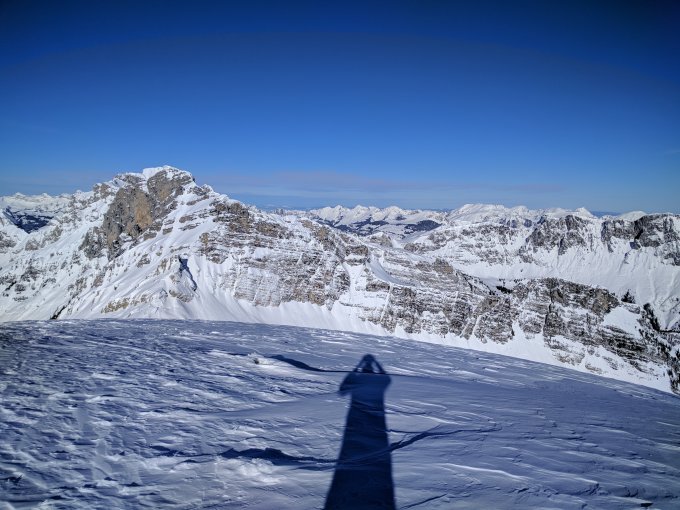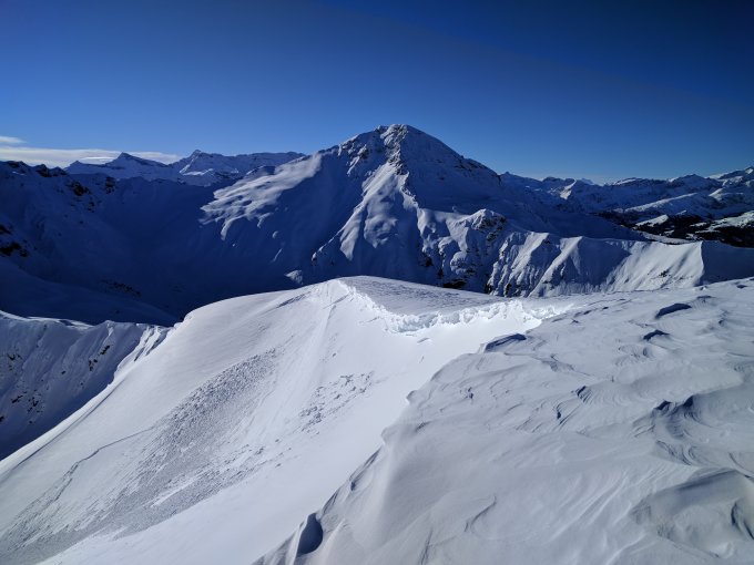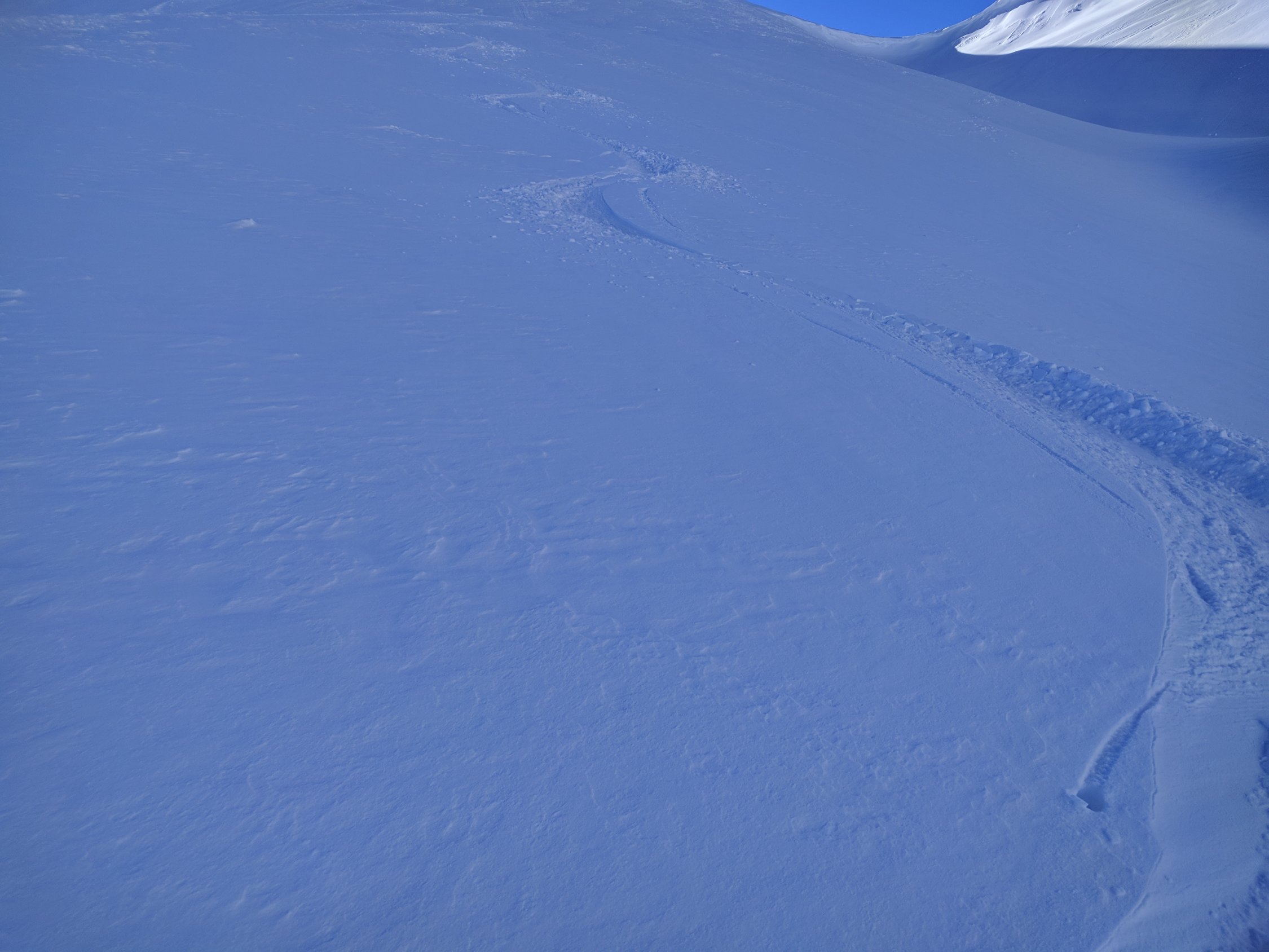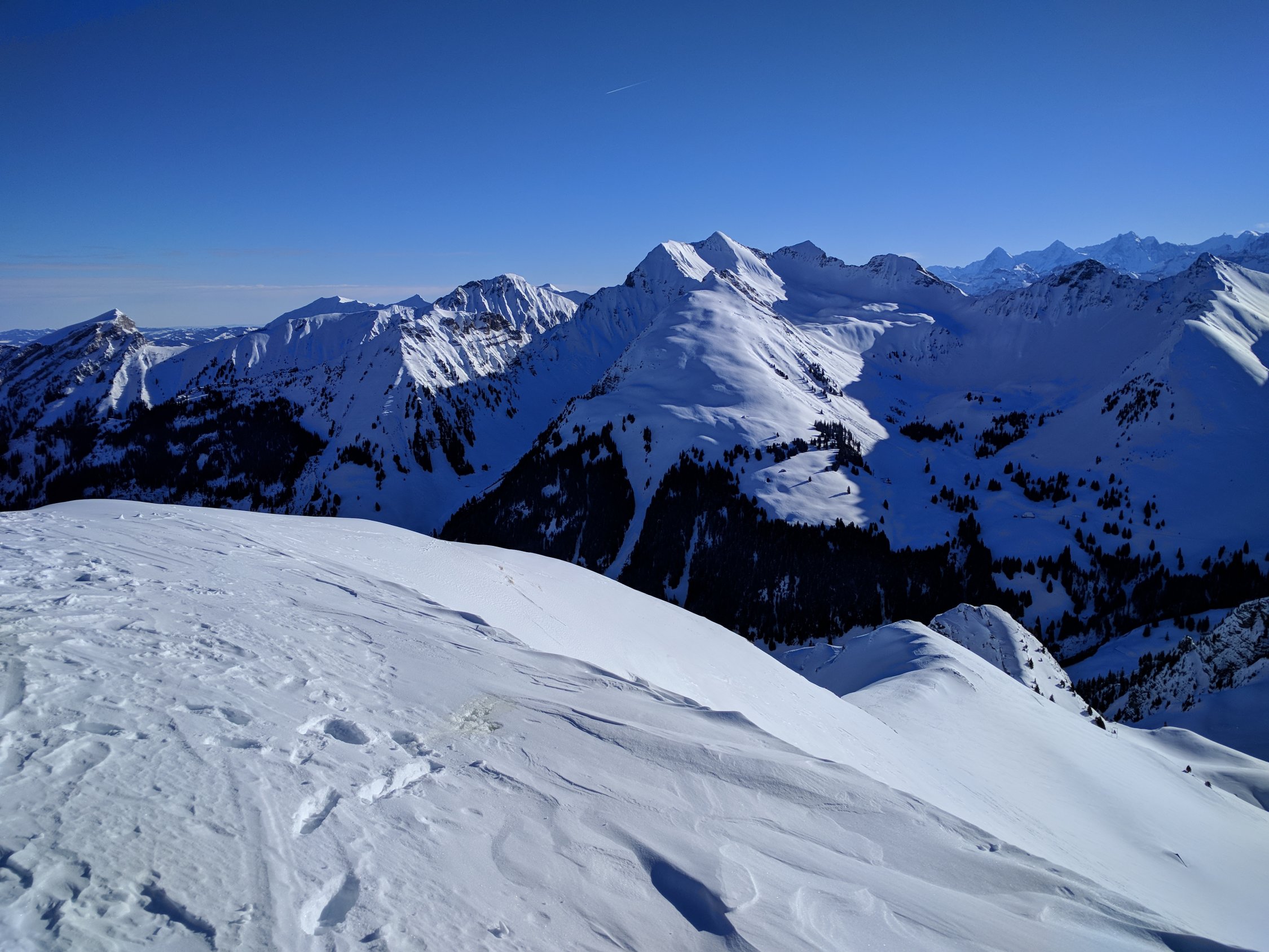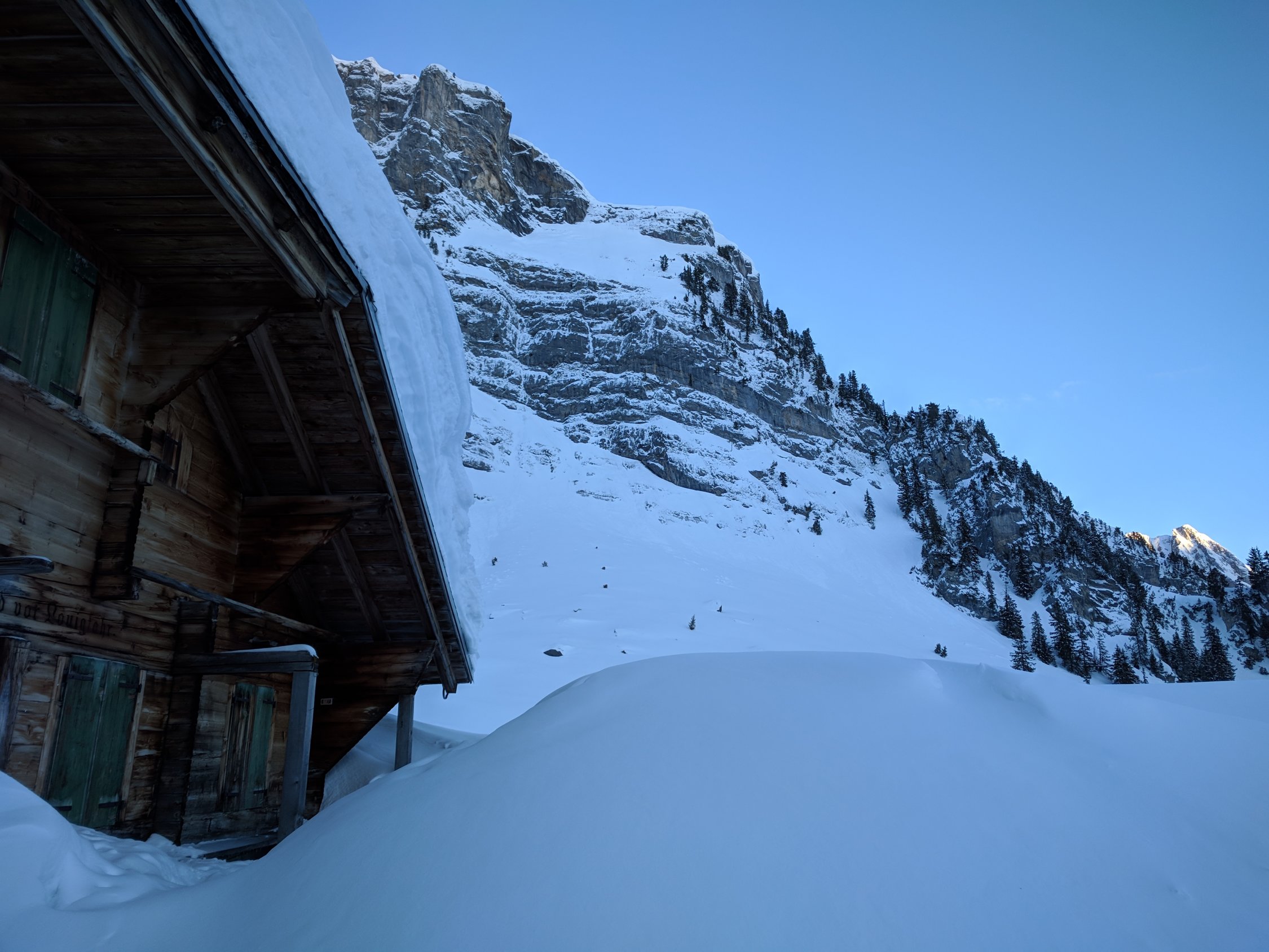 Unten hat's gestern noch etwas reingeregnet, aber es reicht für eine Abfahrt bis zum PP Senggi. Ab Grimmi 20-30cm Pulver, teils etwas windgepresst. Gipfelflanke hart.