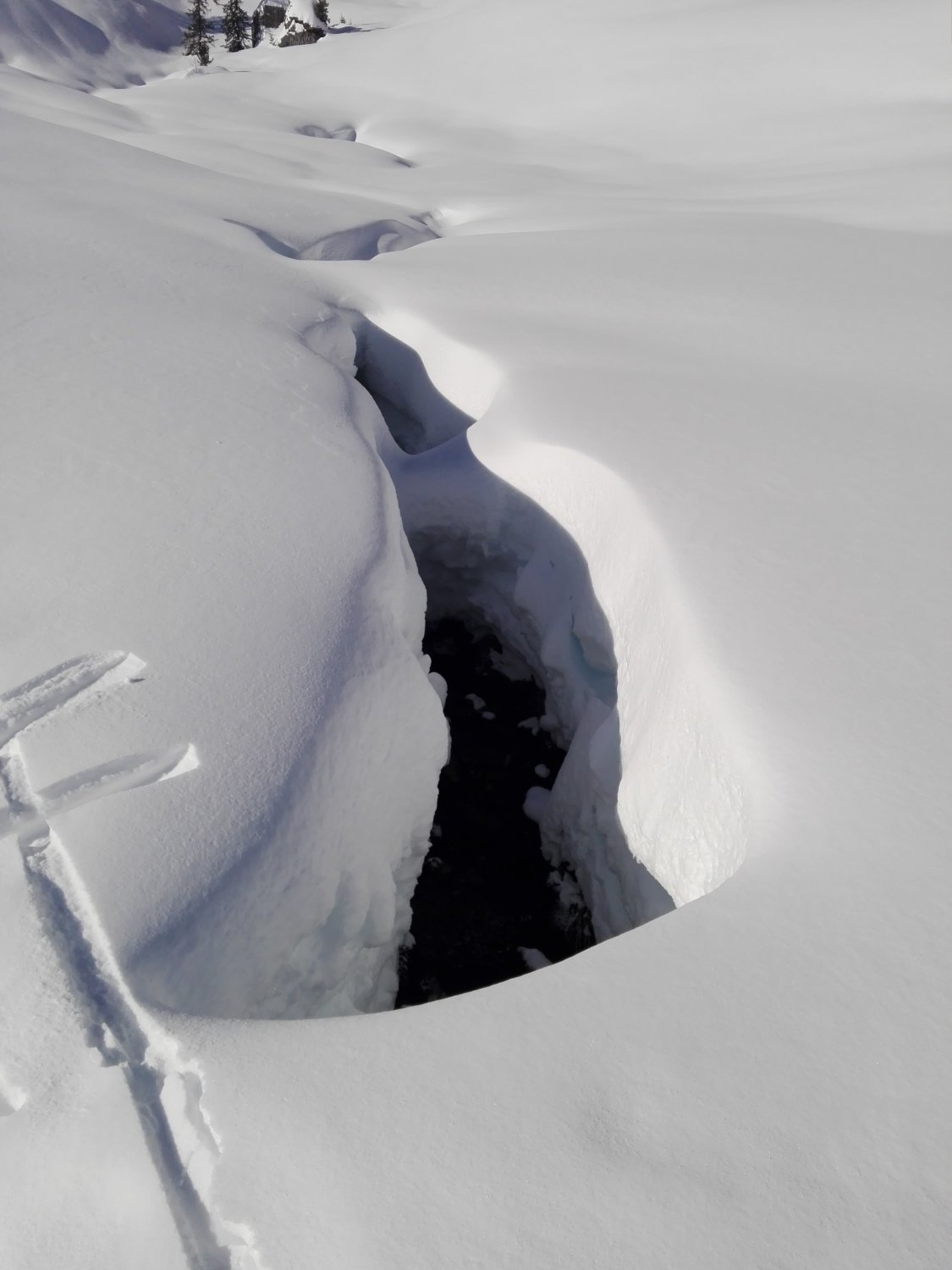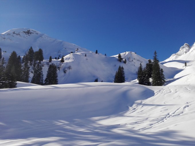 Neige poudreuse sur tout le trajet, sauf en bas, c'est crouté. Poudreuse oui, mais pas légère et froide: Plutôt bien compacte et un tiède mais quand même agréable à skier. Neige un peu plus légère dans les contre pentes de Grimmi.