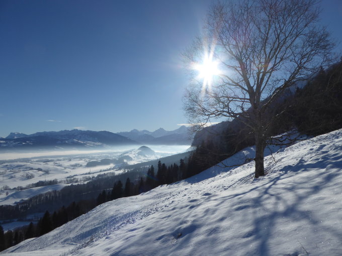 Wenn's schon mal wieder Schnee bis unten hat, ist das die Gelegenheit für die Chrummfadeflue von Blumenstein. Allerdings wollte ich bereits den ersten Zug nehmen und um 6:54 starten, daraus wurde leider nichts, weil Glatteis dazu führte, dass ich den Zug verpasste. Also Start um 7:54, schon nach Sonnenaufgang. Die Sonne heizte dann auch entsprechend ein beim Aufstieg und führte oberhalb Langenegg zu tonnenschweren Stollen. Gewichtheben am Berg... Ich ging davon aus, dass die eher schattige Fortsetzung ab Oberwirtnere mich dann wieder in die Leichtgewichtklasse umteilen würde, und so wars dann zum Glück.