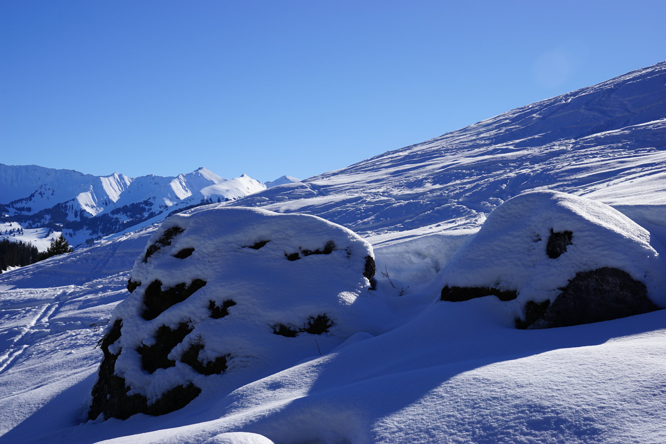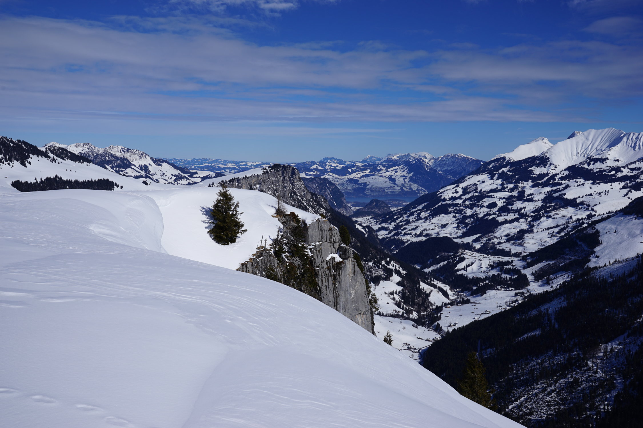 Die Tour ist durchgehend mit Skis begeh- und befahrbar. Ab Parkplatz +1°C um 9:45 Uhr. Die Schneedecke war schon feucht mit eingelagerter Kruste. Angenehme Spur heute. Ab Hütten Gründli besserten die Verhältnisse mehrheitlich Pulverschnee. Gipfel angenehme Temperaturen und kaum Wind. Abfahrt Gipfelhang etwas Windharst gut zu fahren. Steilhang Pulver mit eingelagerter dünner Kruste sehr schön. Jetzt zunehmend durchfeuchtete Schneedecke aber gut drehbar. Unterstes Stück der Alpstrasse entlang.