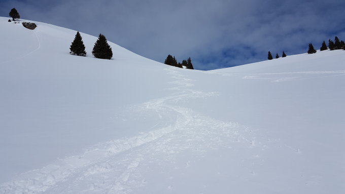 Dünne Schneedecke bis 1350 MüM, darüber schön eingeschneit. Mit der schönen Morgensonne heute eine ideale Grippen-Rehabilitationstour :-).