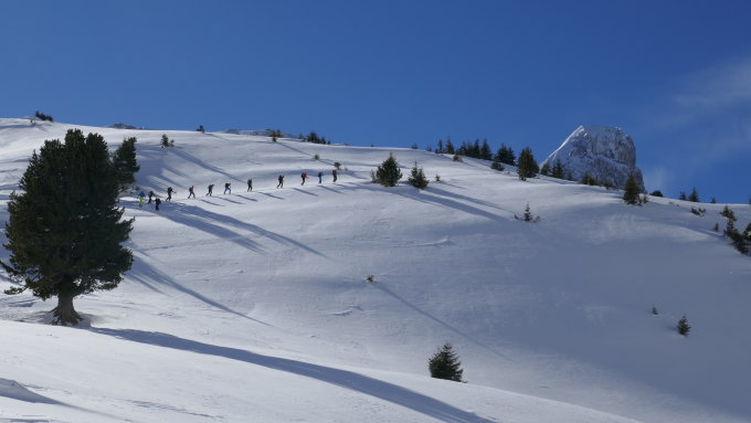 Ab 1600m hatte es erstaunlich viel Pulverschnee, der teilweise sehr stark verfrachtet wurde. Der Geländerücken von Alpetli zum Mariannehubel ist vollständig eingeschneit.