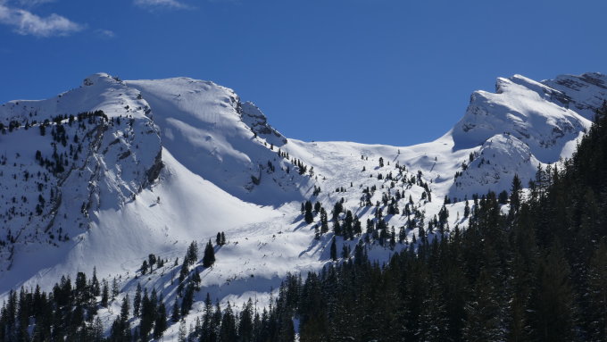Ein frisch abgegangenes Schneebrett im Chelli auf ca. 1800m; wohl durch Tourengänger ausgelöst. Durch die Sonneneinstrahlung lösten sich aus den Felwänden des Seehorns ständig kleinere Lawinen.