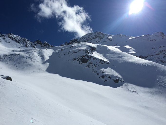 Es liegt viel Schnee. Die Route ist ab P. 1561 meist nordexponiert, somit war der Schnee meist pulvrig. Im obersten Teil allerdings mit windgepressten Stellen gemischt.