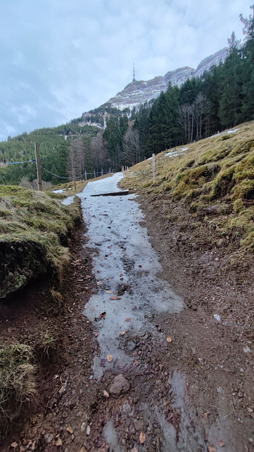 Im Wald nach der Seebodenalp bis zum Staffel viele eisige Stellen, Grödel sehr zu empfehlen.