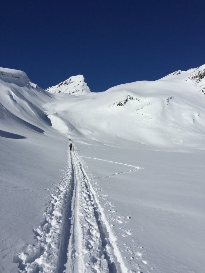 Gute Spur im Aufstieg, ohne Harsteisen bis auf den Gipfel.