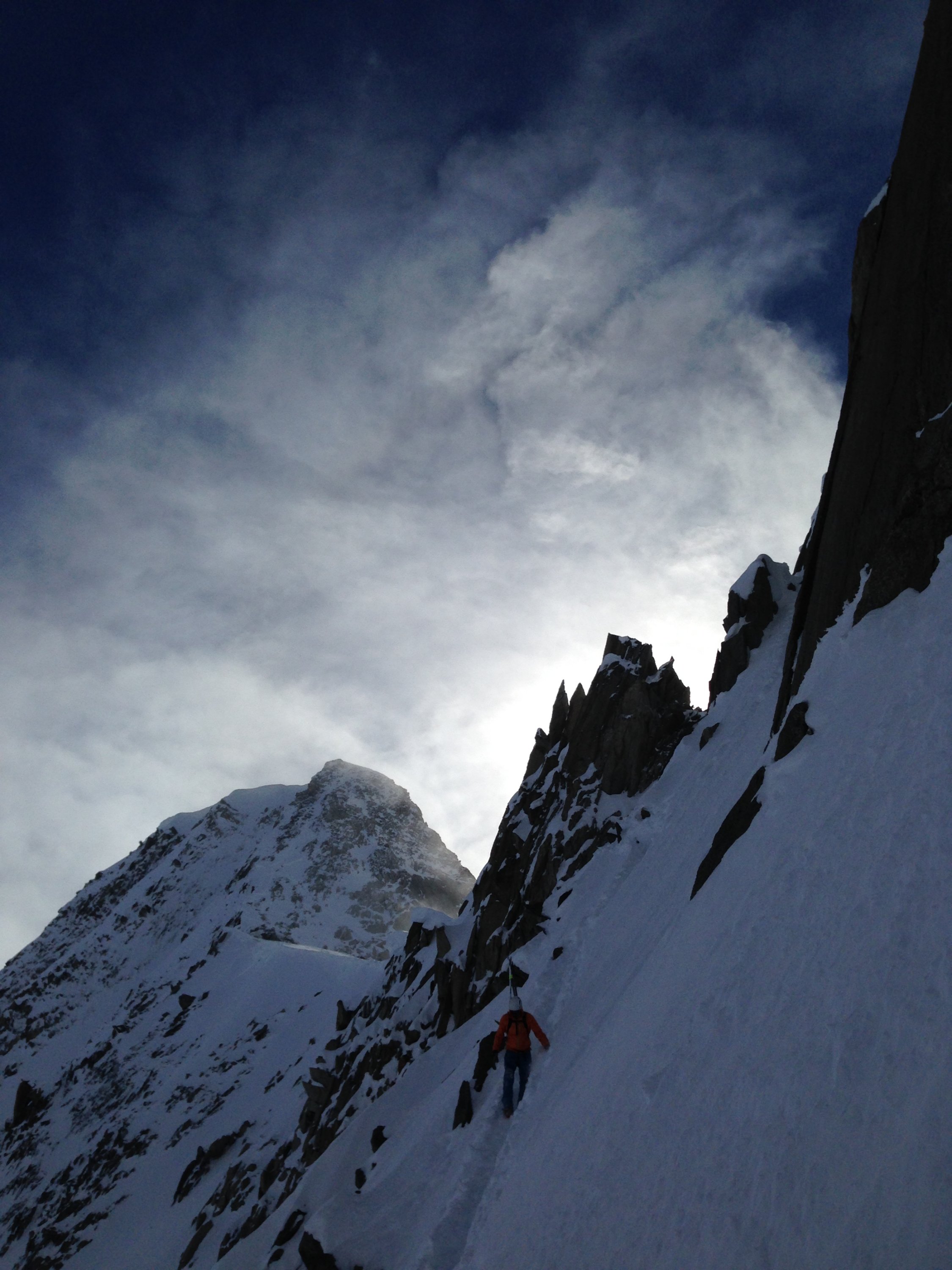 Gute Verhältnisse. Viel Schnee hoch zum Grat, aber jetzt gespurt bis zum Gipfel.