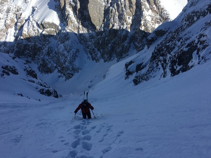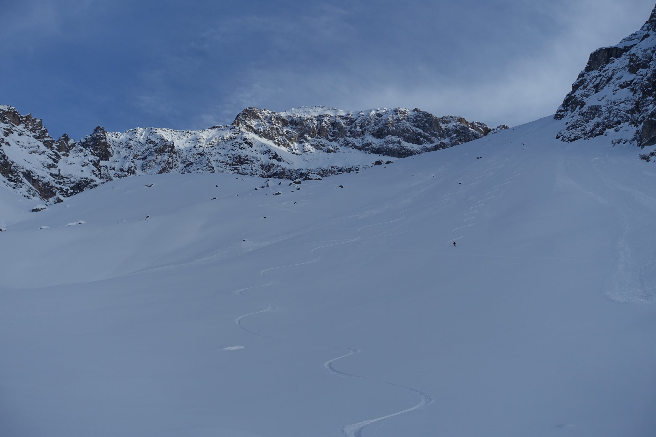 Heute tiefer Pulver ohne Windeinfluss bis zuoberst. Absolut einsame Tour bei besten Verhältnissen. Ausstieg zum Gipfel gemacht, Abfahrt unten durch den Graben war ok, einige Lawinenkegel waren zu überfahren...
