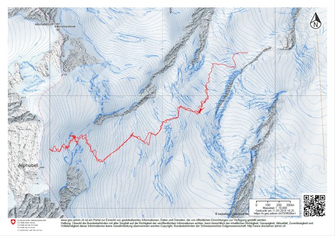 Da gerade sehr viel Schnee in Saas-Fee liegt sind die Spalten sehr gut zugedeckt. Am morgen war der Wind teilweise recht stark und es hat leicht geschneit. Wir sind erst um ungefähr 11:30 von der Längflue gestartet und mussten aus Zeitgründen auf 4100 m.ü.M. umkehrt. Das Spuren durch den Pulverschnee war ziemlich kraftraubend und wir kamen mit nur 250 Höhenmeter pro Stunde voran. Eine Spur vom 08.03. oder 09.03. war noch teilweise zu erkennen. Mit dem Wind können sich kleine Triebschneesammlungen in dem steilen Schlusshang bilden, aber der Rest der Tour schien relativ Lawinensicher zu sein. Ich denke Spaltenstürzen bei der Abfahrt machen das Hauptgefahr der Tour aus.