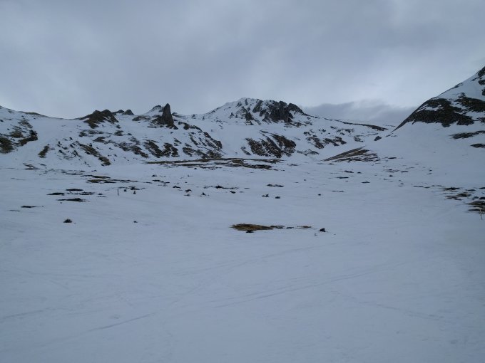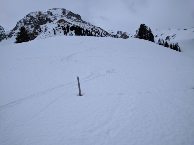 Feuchter Frühlingsschnee unten (bereits morgens um 6:30 +5 Grad), kompakter Altschnee oben. Die Route durch den Ofen apert immer mehr aus, wird bald nicht mehr möglich ohne Tragepassagen.