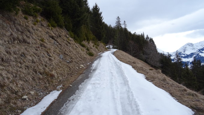 Ab 1330m oberhalb Schopf genügend Schnee zum Aufsteigen auf der Fahrstrasse