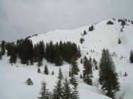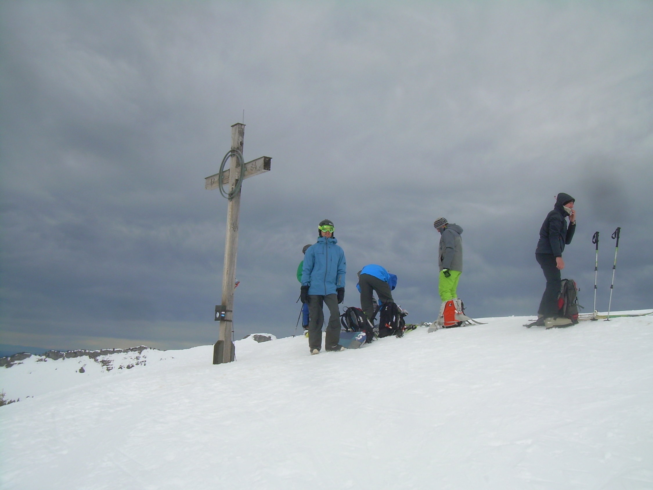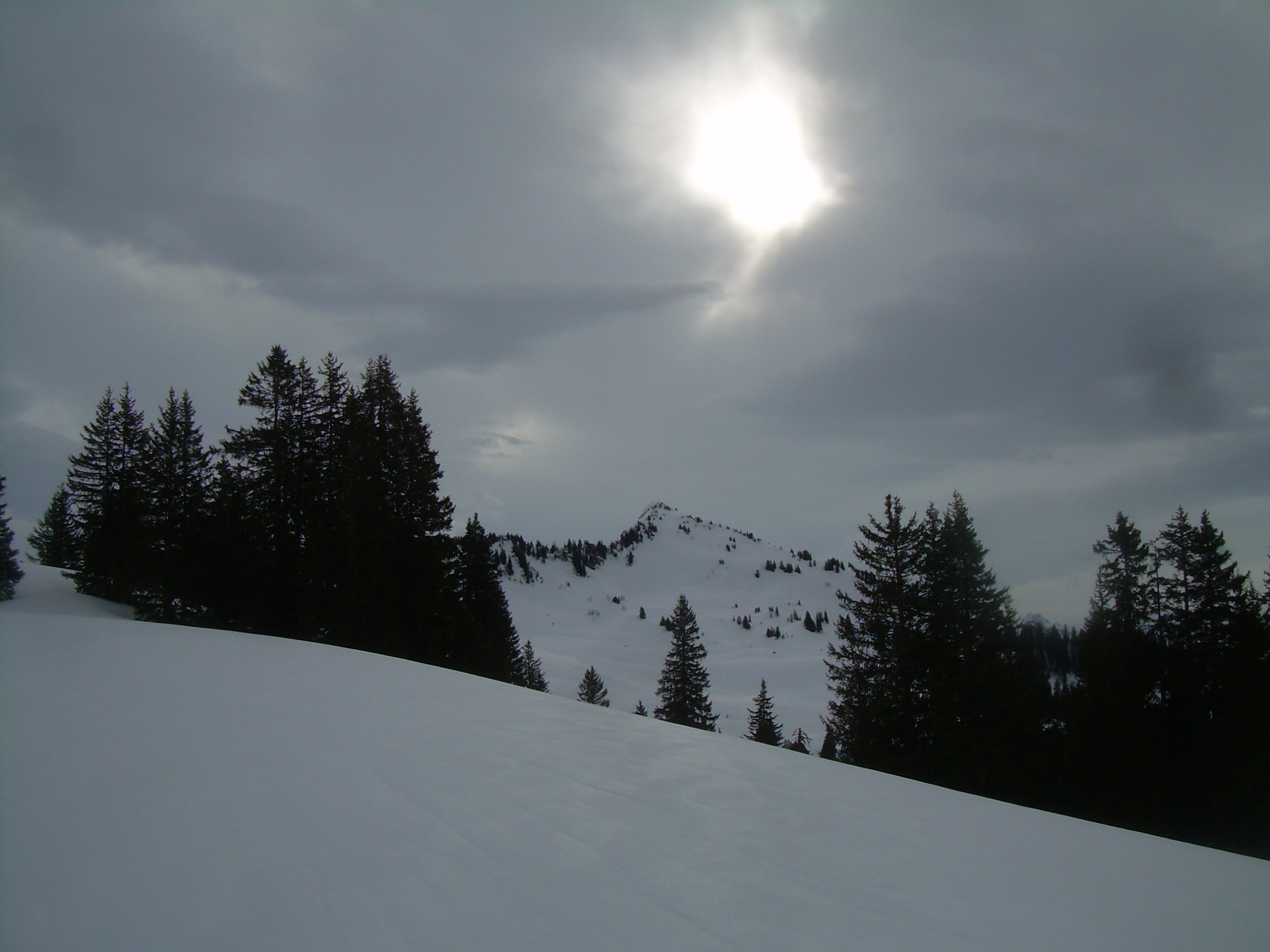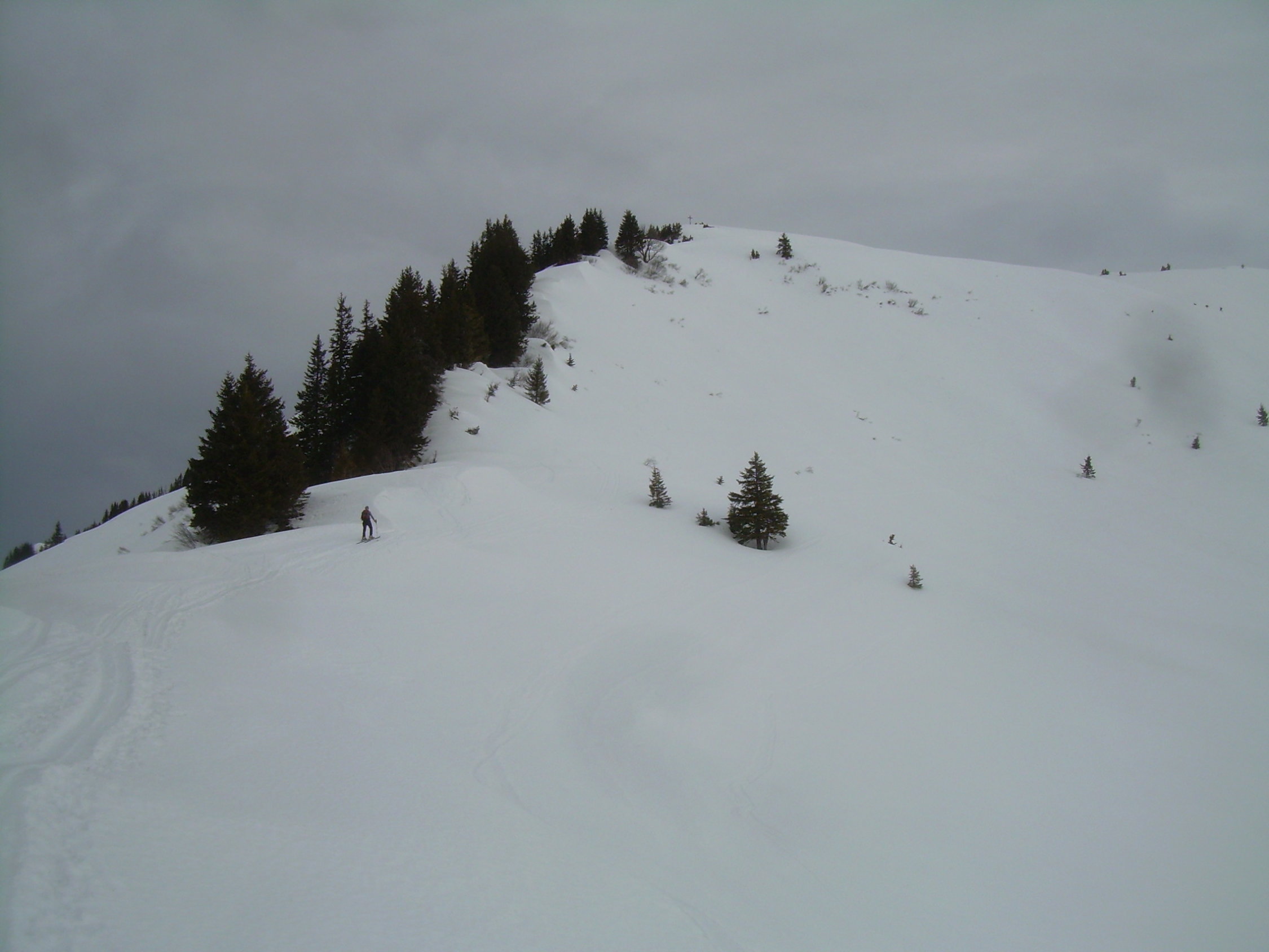 Schneedecke: durchfeuchtet, in der Aufstiegsspur tragend. Der Abstieg gg. 13 h war für mich mit Schneeschuhen etwas mühsam, da die Oberfläche der Schneedecke nicht mehr trug. Dennoch hatte ich Glück, dass die Sonne heute kaum durchkam, andernfalls wäre ich im Südhang des Gehrenfalben sicherlich bedient gewesen.