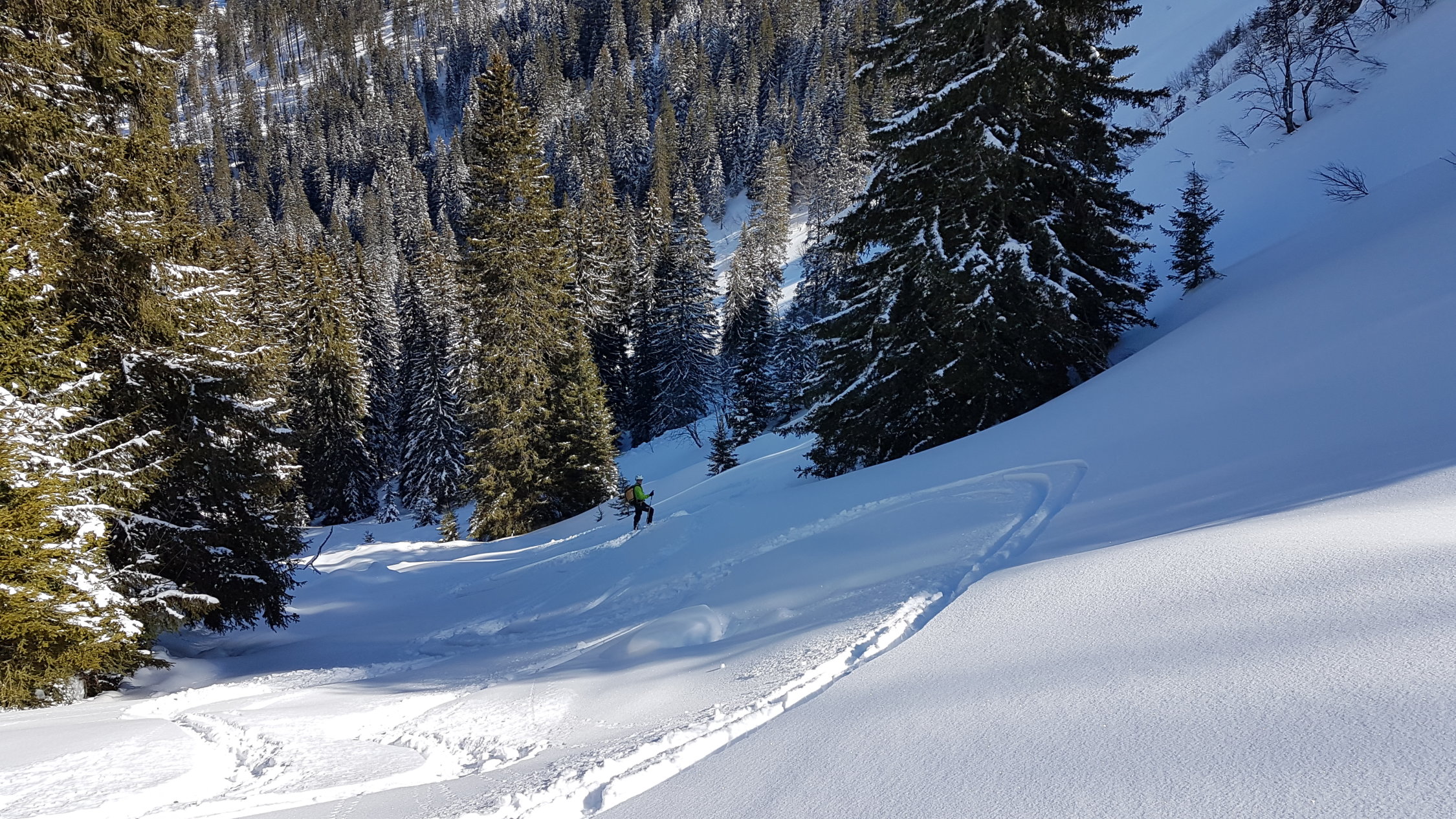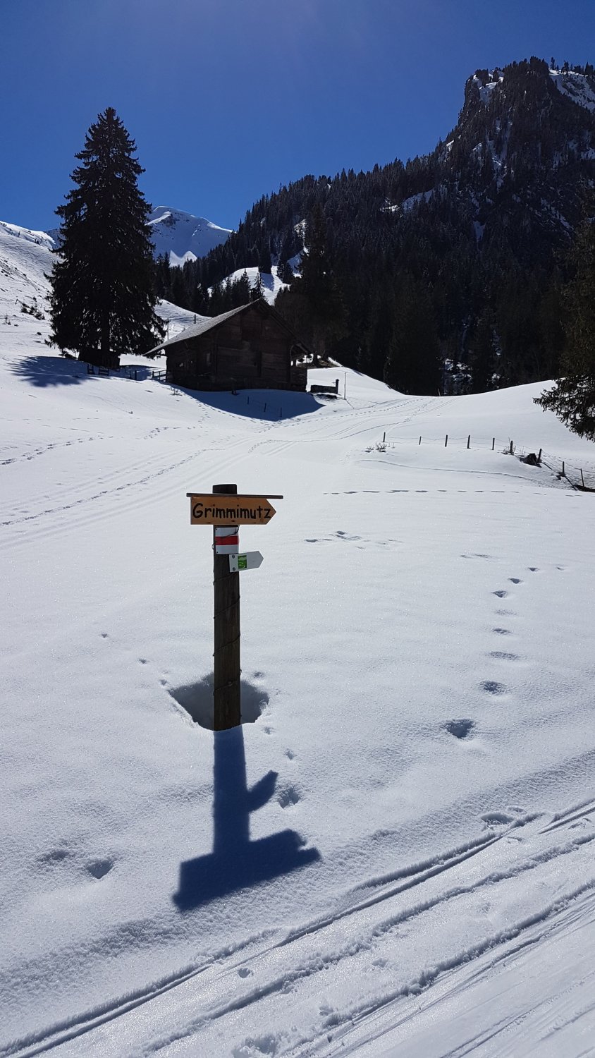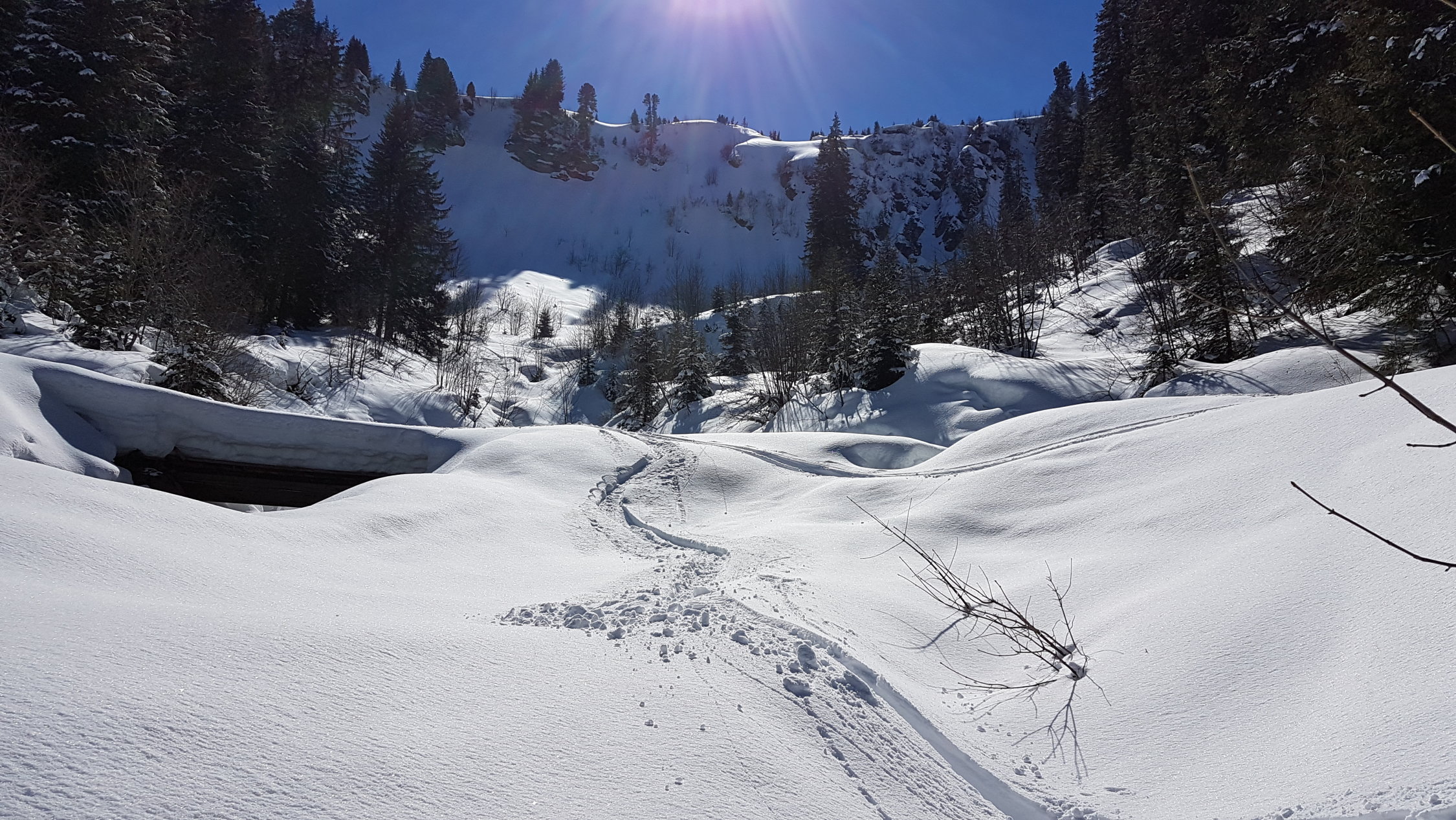 Es hatte genügend Schnee um bei der Alp Grimmi direkt in den Nidegg-Graben zu stechen. Auch im Graben hat es Unmengen von Schnee. Unterhalb 1350 MüM hat es dann nur noch genügend, aber erfreulicherweise bis zum Parkplatz.
