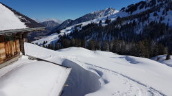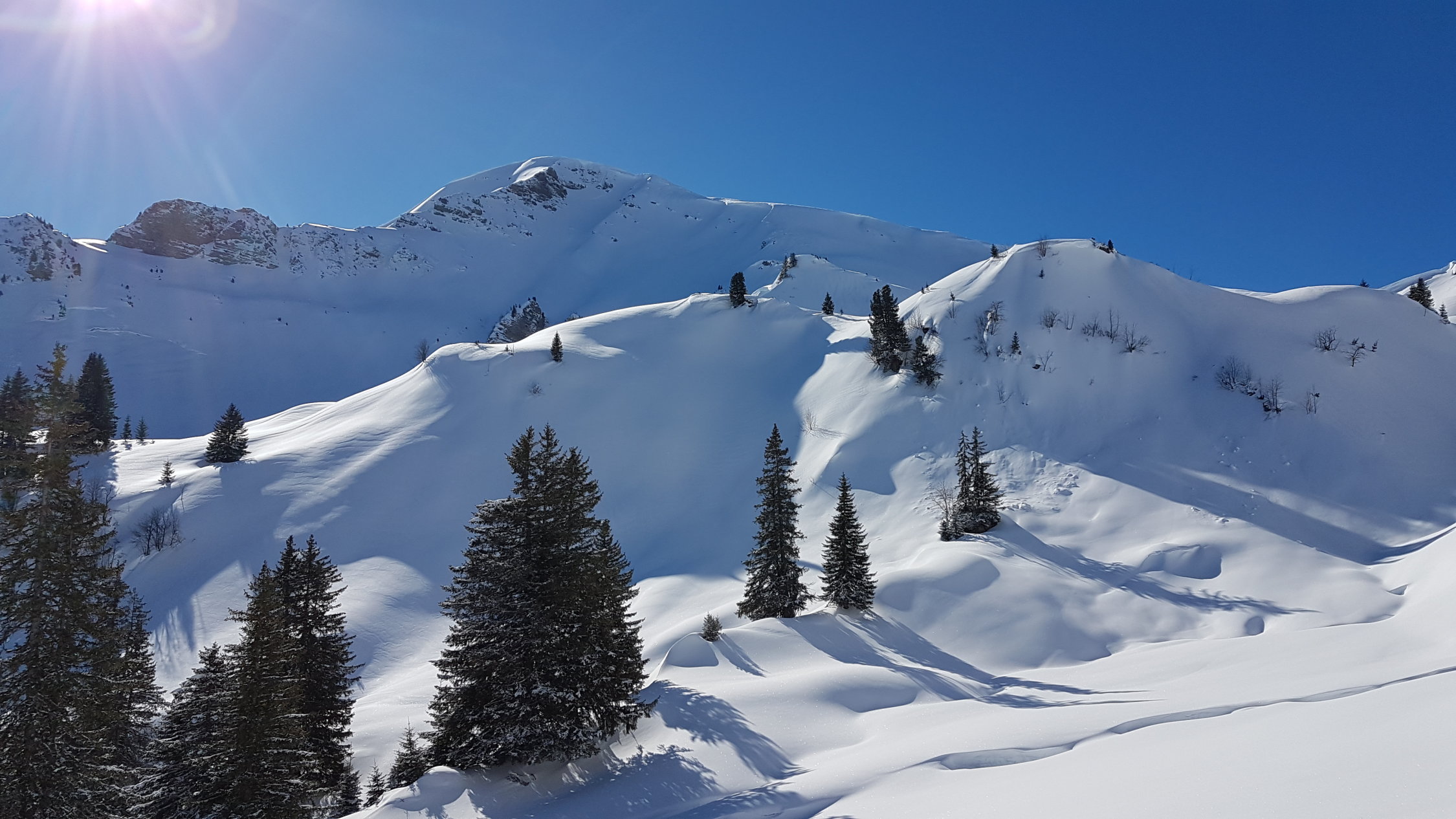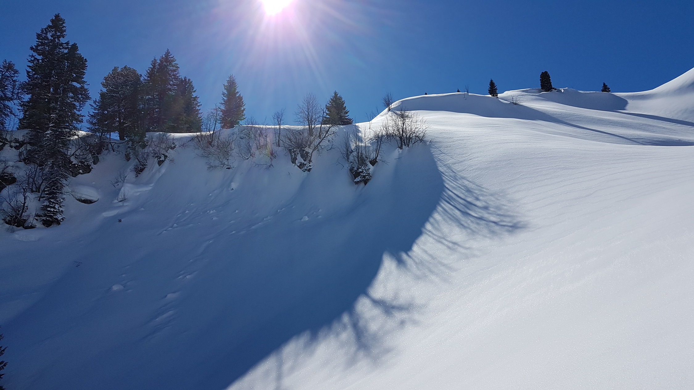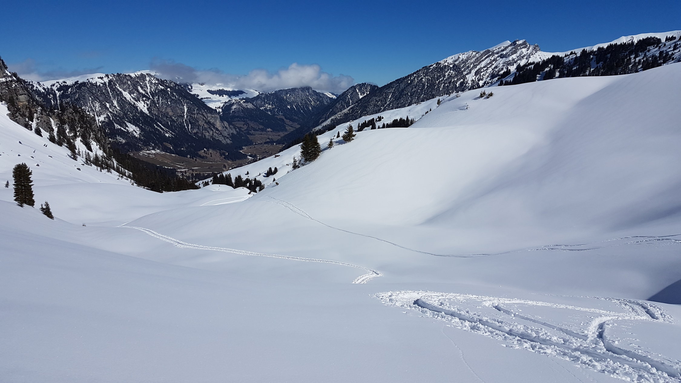 Es hatte genügend Schnee um bei der Alp Grimmi direkt in den Nidegg-Graben zu stechen. Auch im Graben hat es Unmengen von Schnee. Unterhalb 1350 MüM hat es dann nur noch genügend, aber erfreulicherweise bis zum Parkplatz.