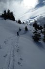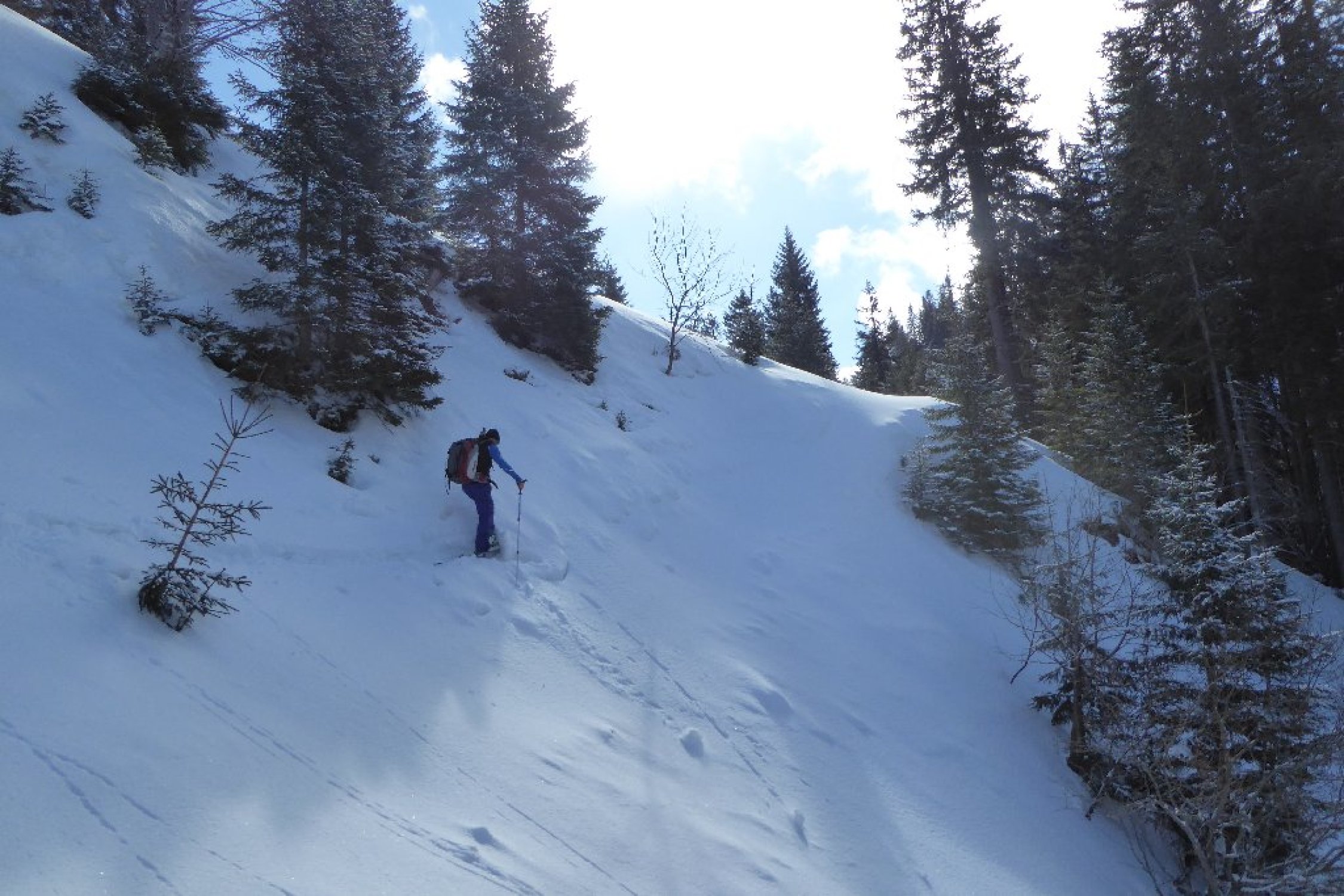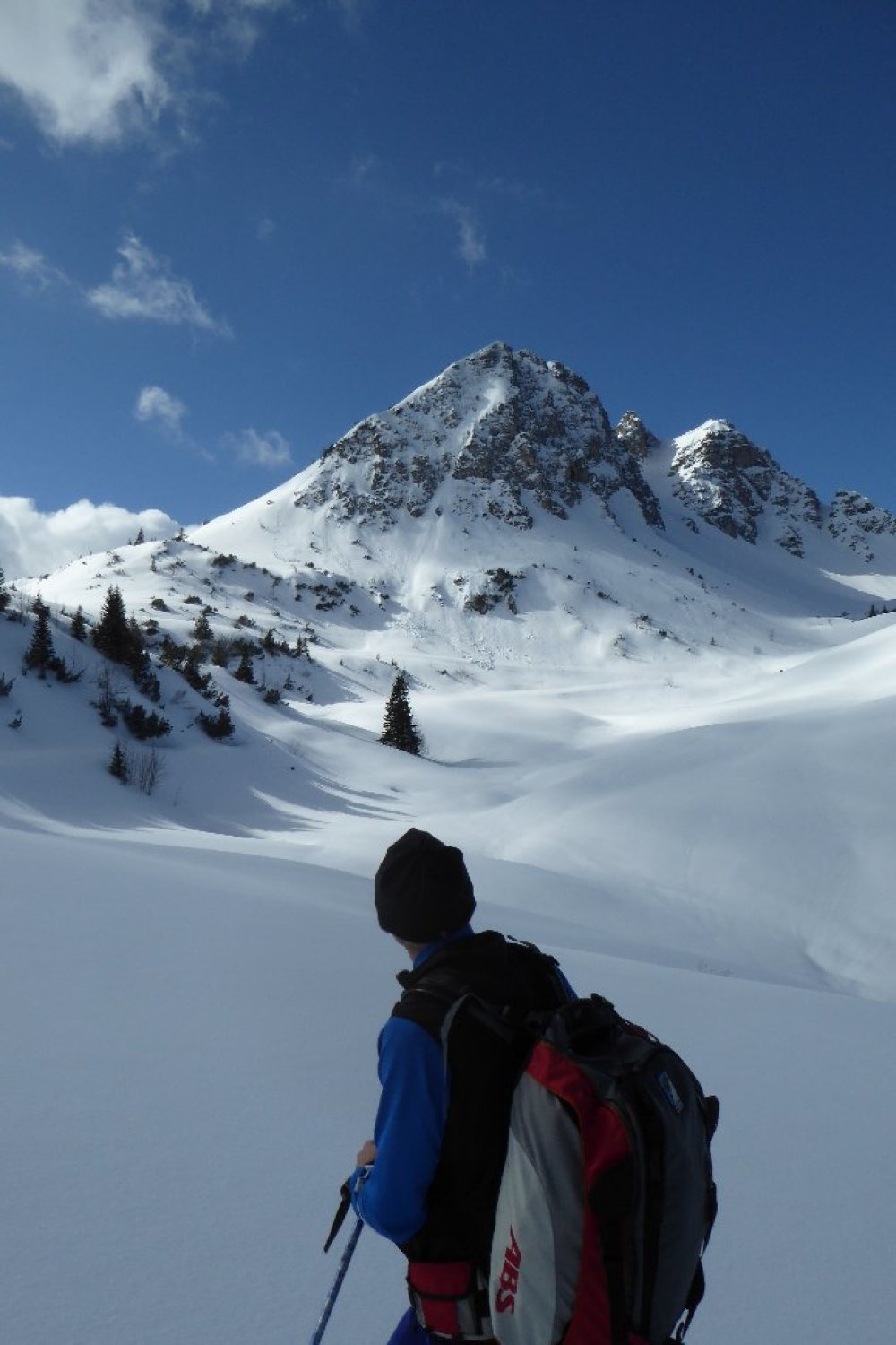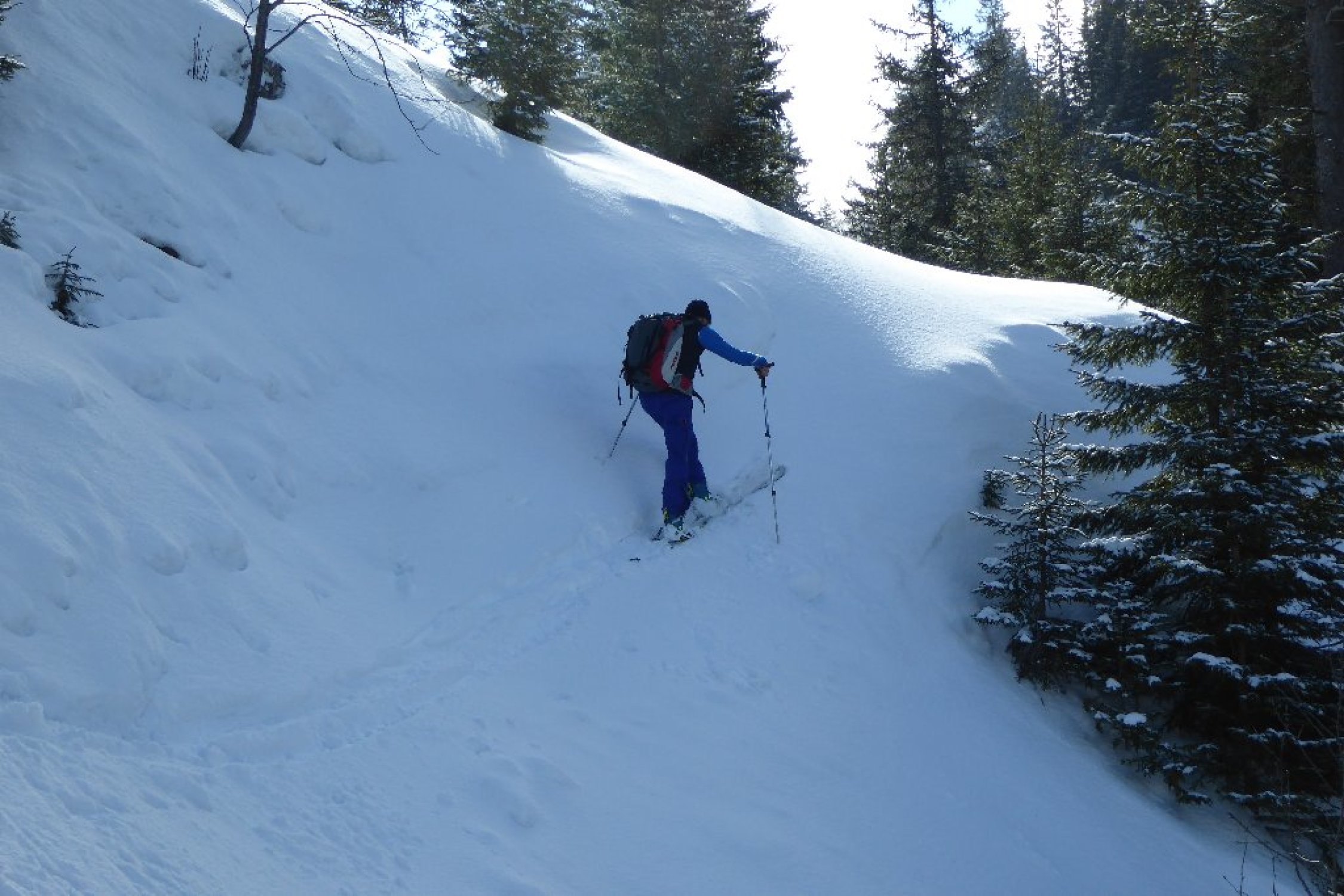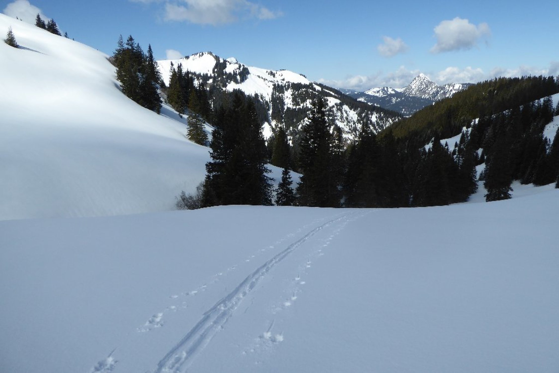Besser als vermutet, im Tagesverlauf wurde Wetter richtig gut. Sommerweg ins Strindenbachtal gut eingeschneit. Ab Abzweig unverspurt mit leichter Neuschneeauflage bis Forststrasse zwischen den Ödenalpen. Dort auf vorhandener Spur vom Skigebiet her durch Südflanke hoch. Kurz vor Gipfel alles abgeweht glasig und hart, aber kein Problem. Abfahrt Top durch Südrinne, lockere Neuscheeauflage auf tragendem Grund. Rest wie Aufstieg unten dann schon z.T. etwas aufgeweicht. Forstwege dann wieder gut.