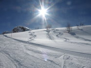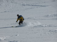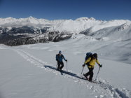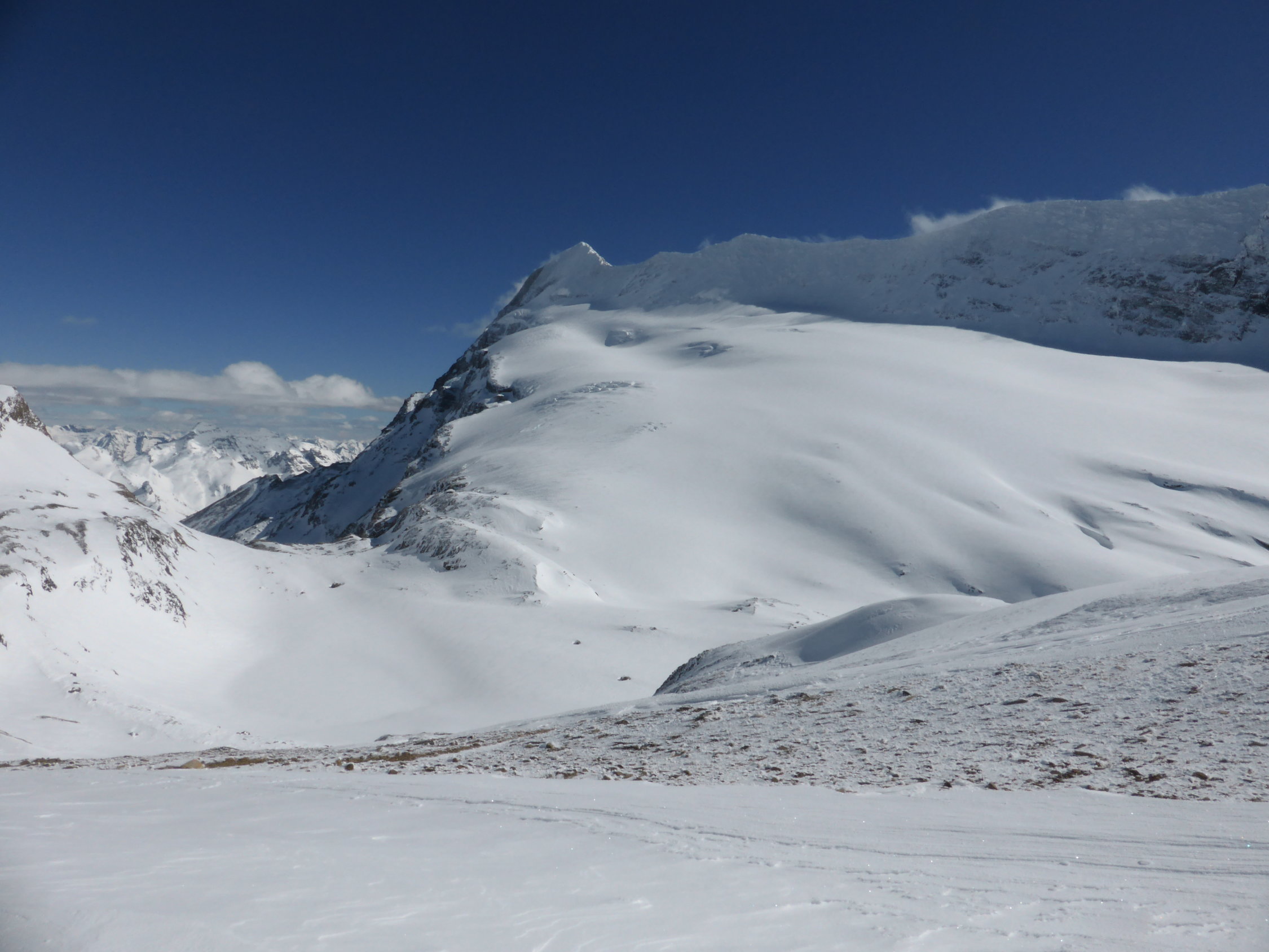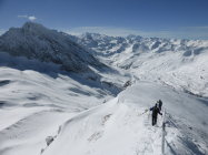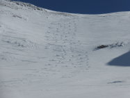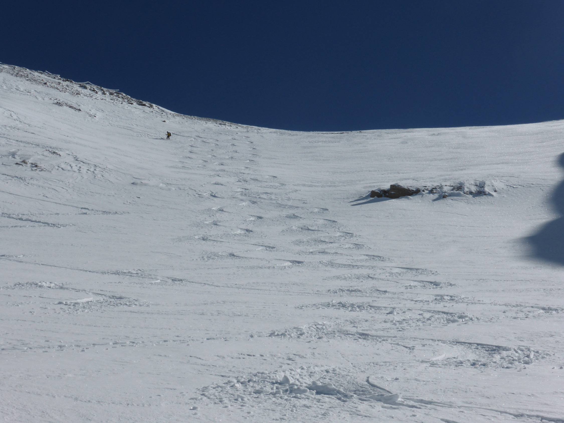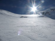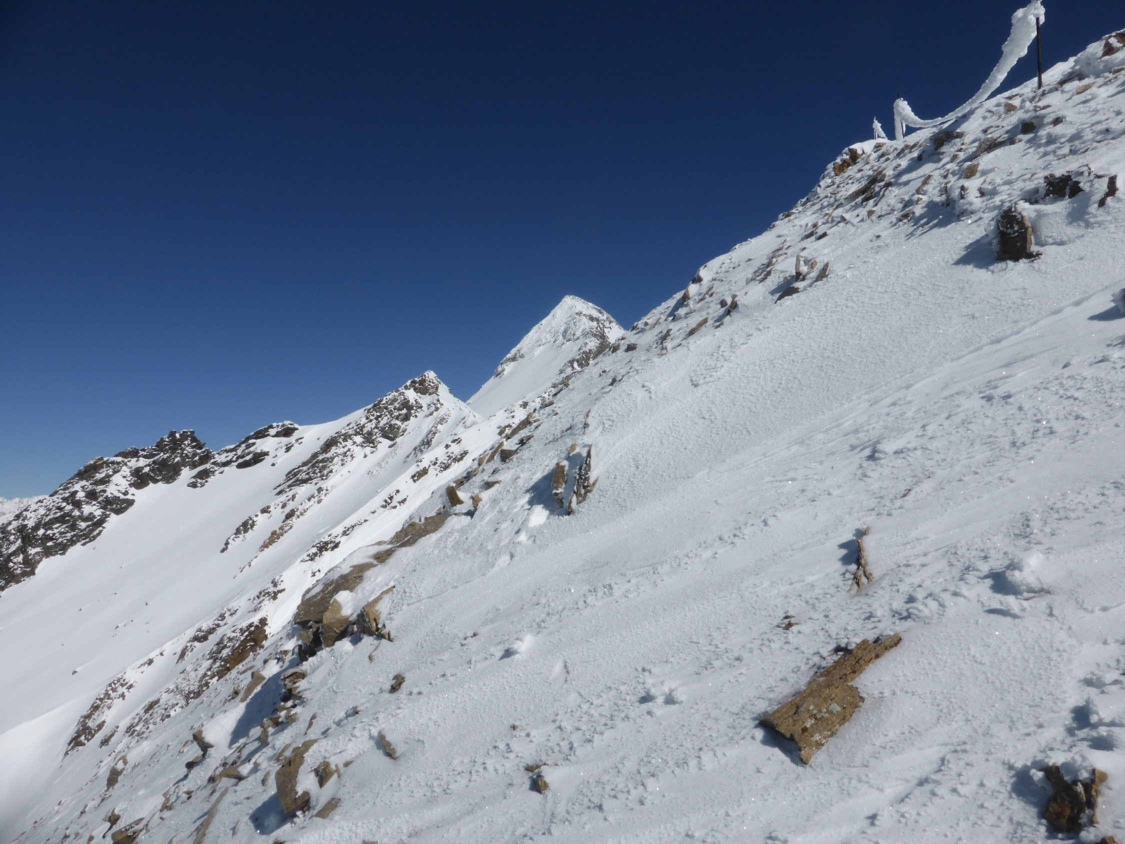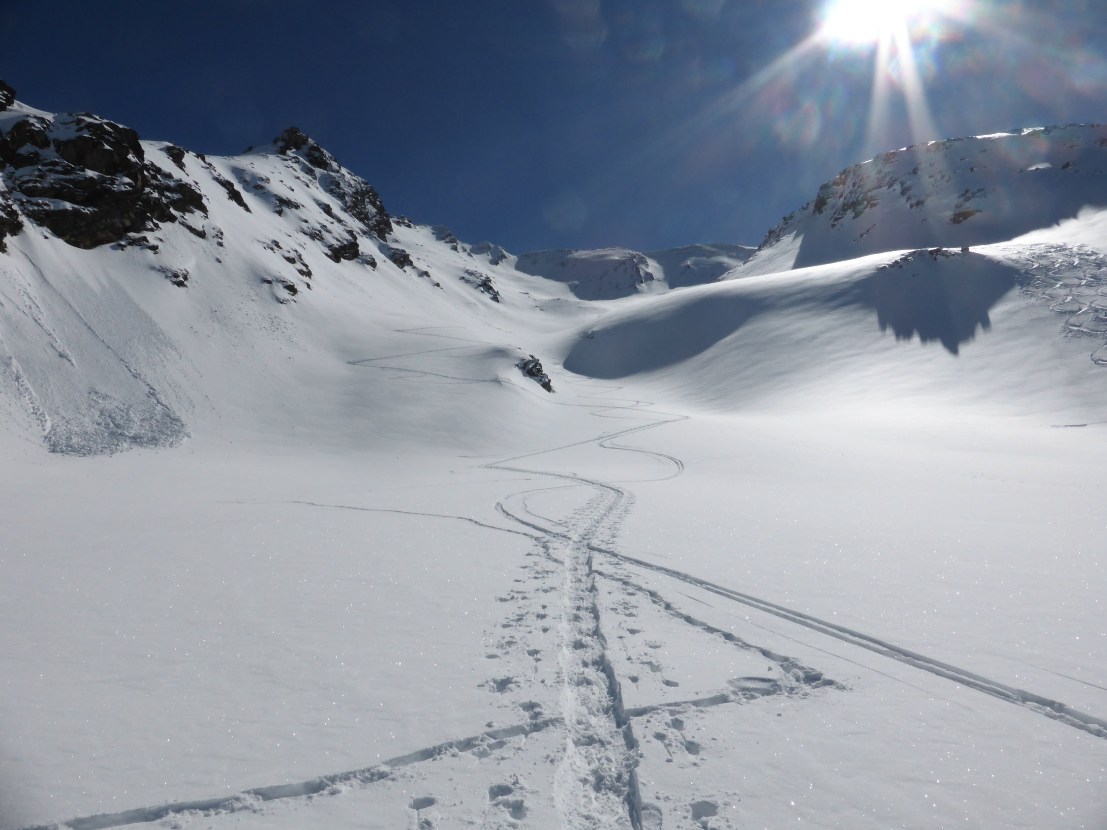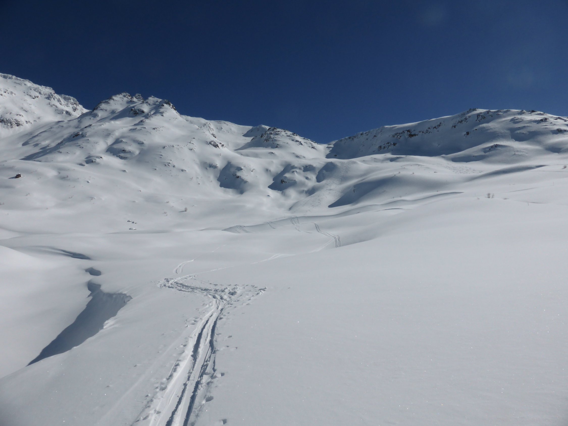 Schnee: gute Aufstiegsspur in Pulverschnee, steiler Schlusshang teilweise leicht gedeckelt, hat aber den Abfahrtsgenuss in keiner Weise gemindert, diesen sind wir auch mit entsprechender Vorsicht angegangen(möglichst nahe von Felsen im Aufstieg, Einzelabfahrt) obwohl wir absolut keine Warnhinweise(Wummgeräusche, Rissbildung usw.) vernommen haben