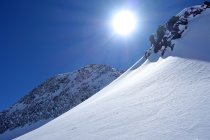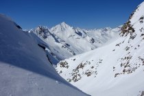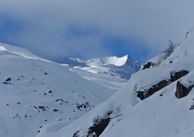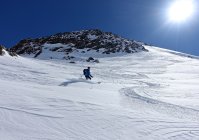 In Realp etwa 10 cm Neuschnee, oben deutlich mehr! Über den relativ flachen Muttengletscher eher zuviel der weissen Pracht, so dass nur ganz oben und wieder unten gute Schwünge möglich waren.