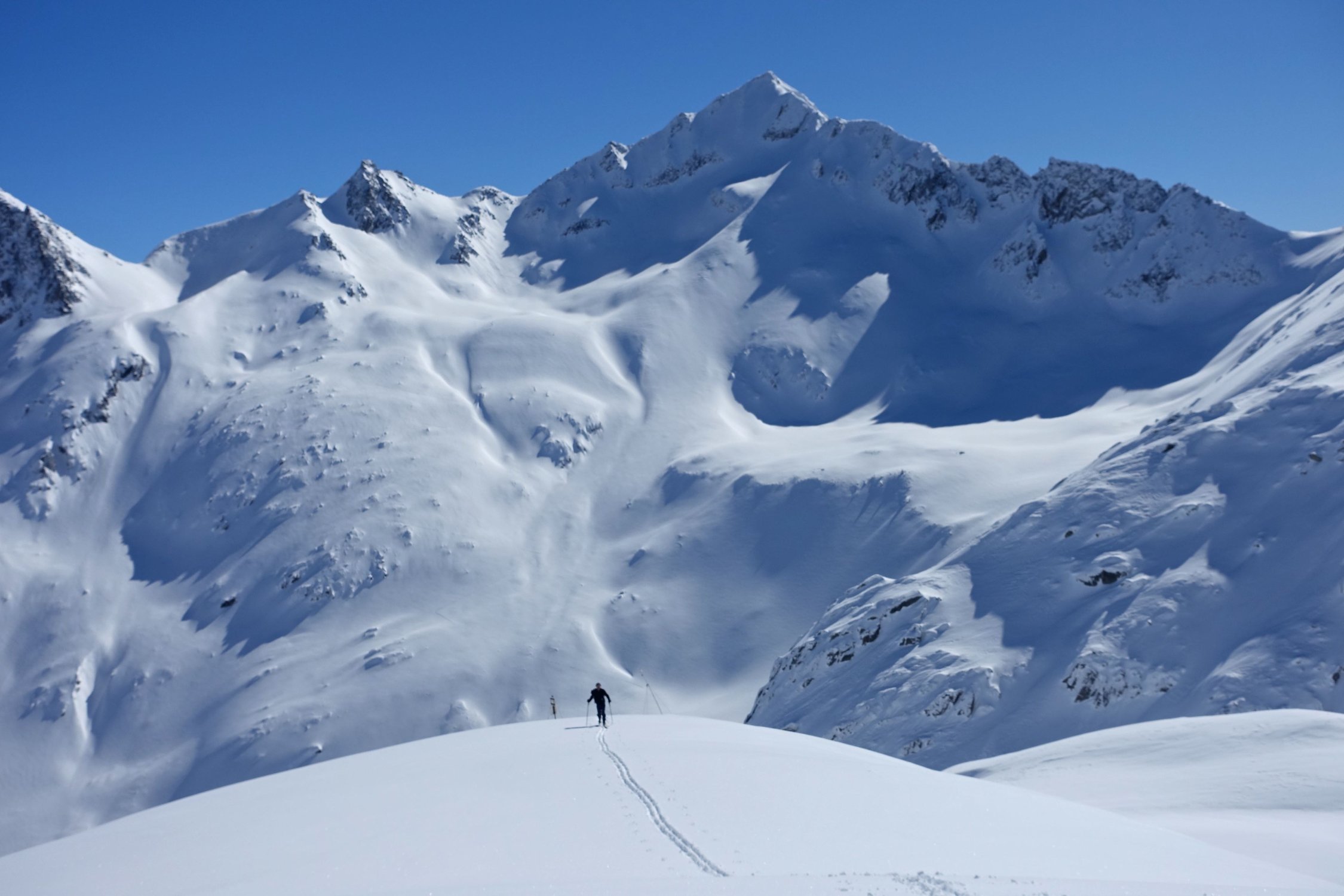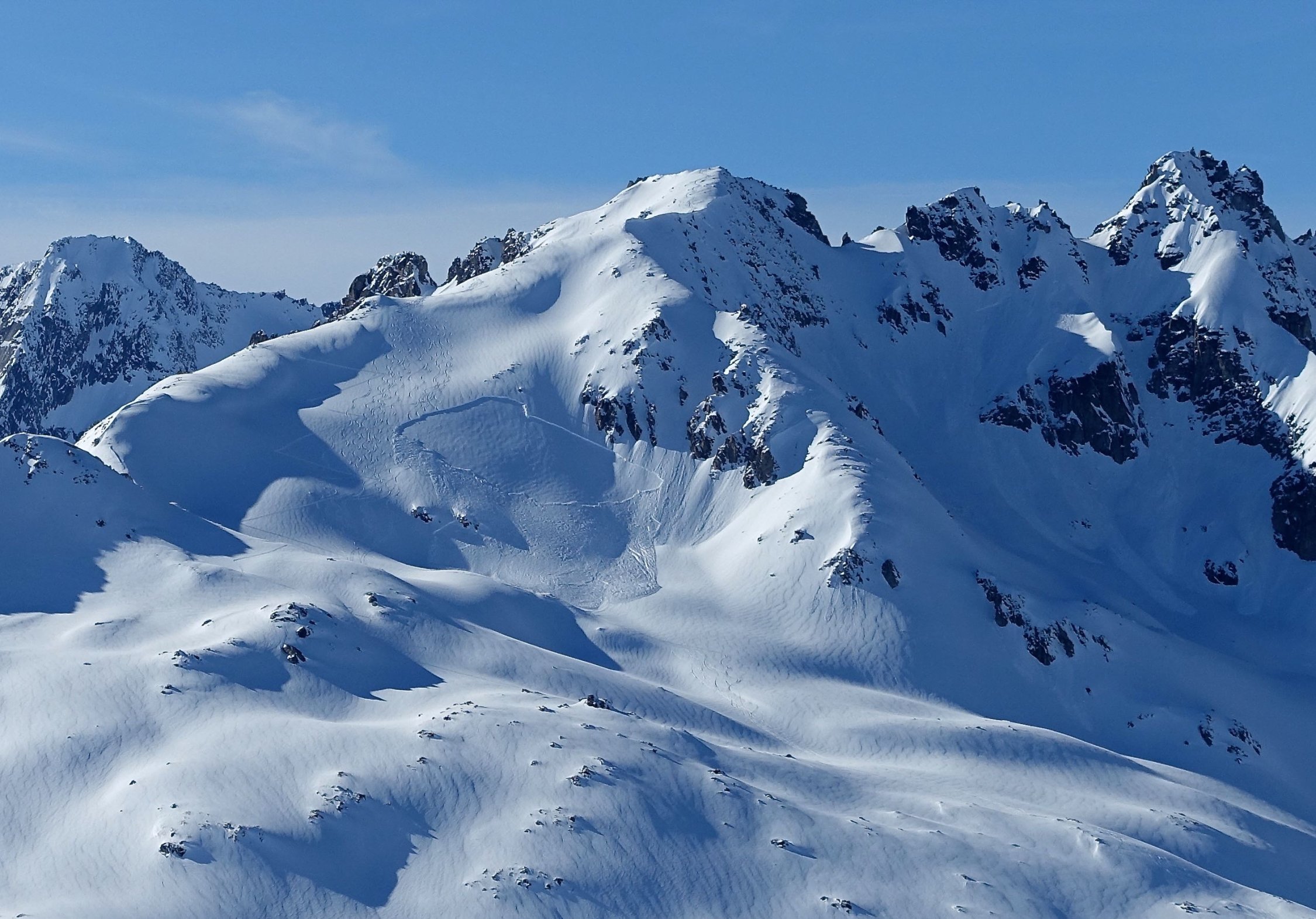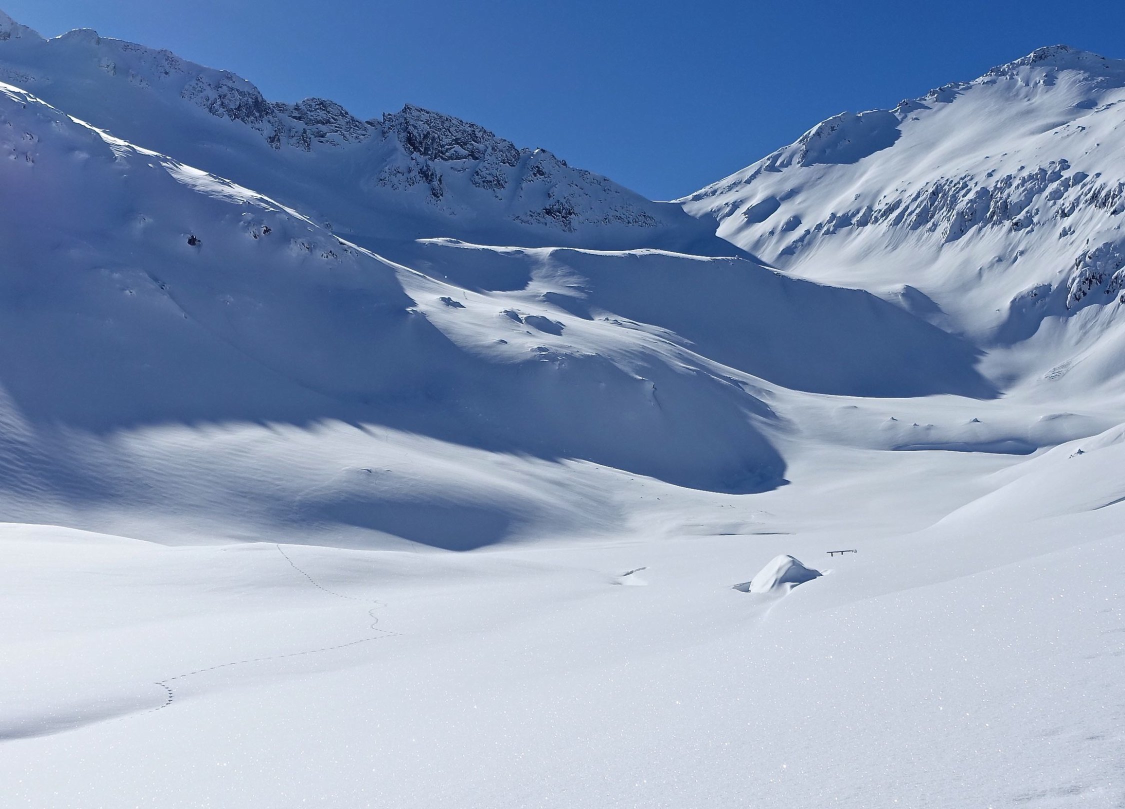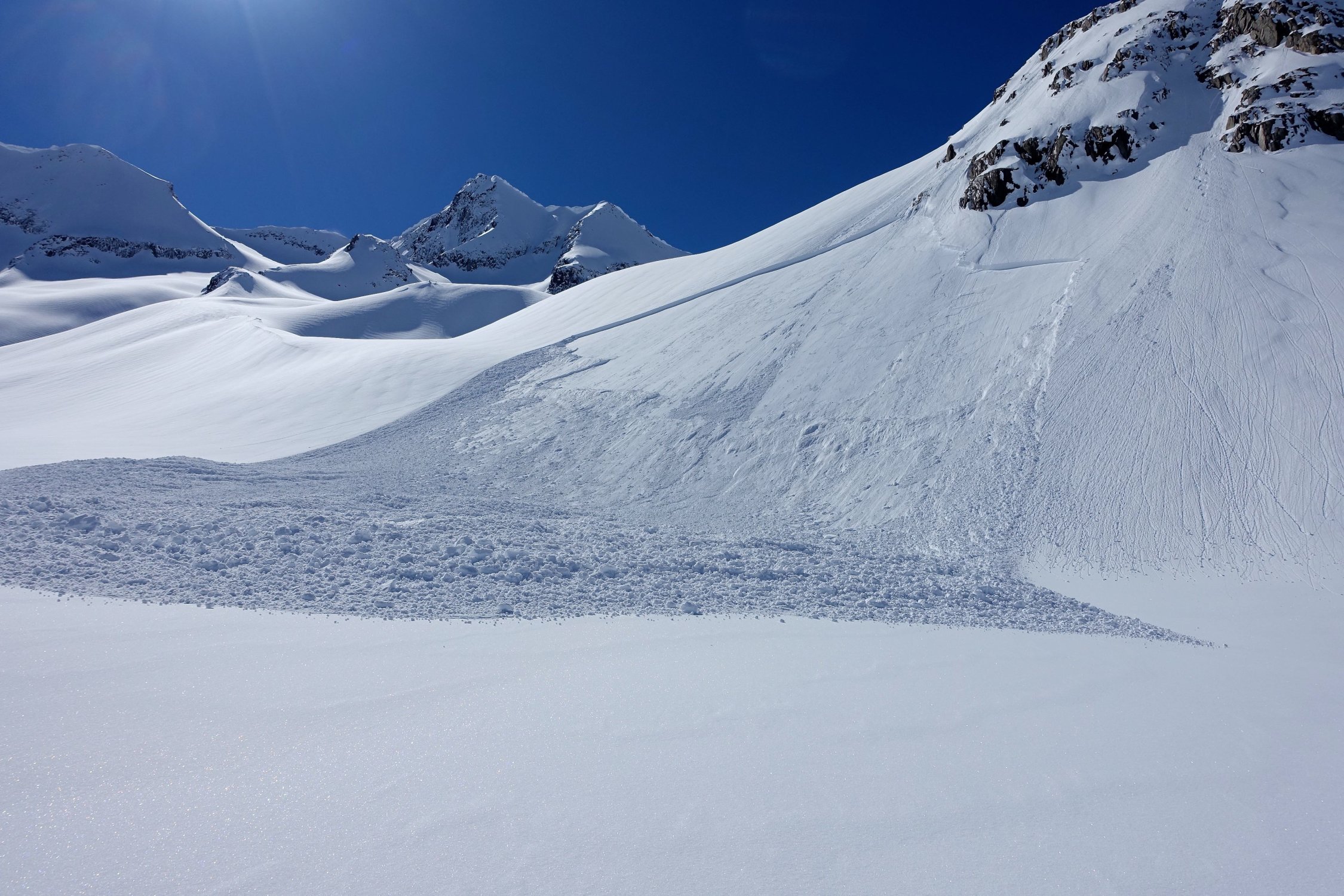 Top Wetter und herrlicher Pulverschnee auf der ganzen Route! Die Querung vom Leckipass zum Skidepot schien mir heute aber infolge sehr viel Triebschnee zu heikel, so dass wir auf den Gipfelaufstieg verzichteten. Dass spontane Schneebretter im Gebiet abgehen konnten, siehe die Bilder.