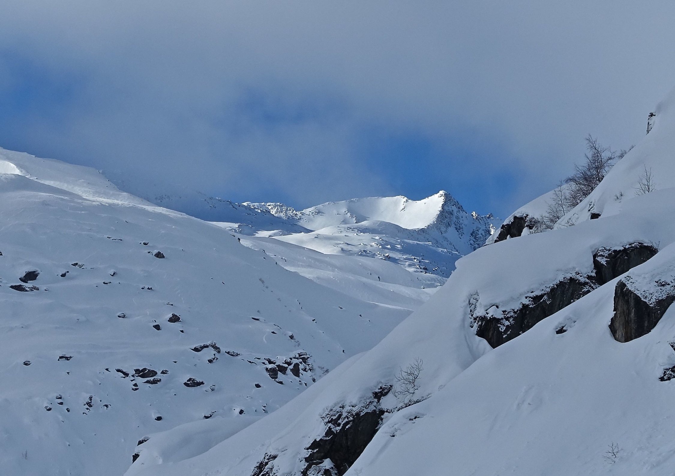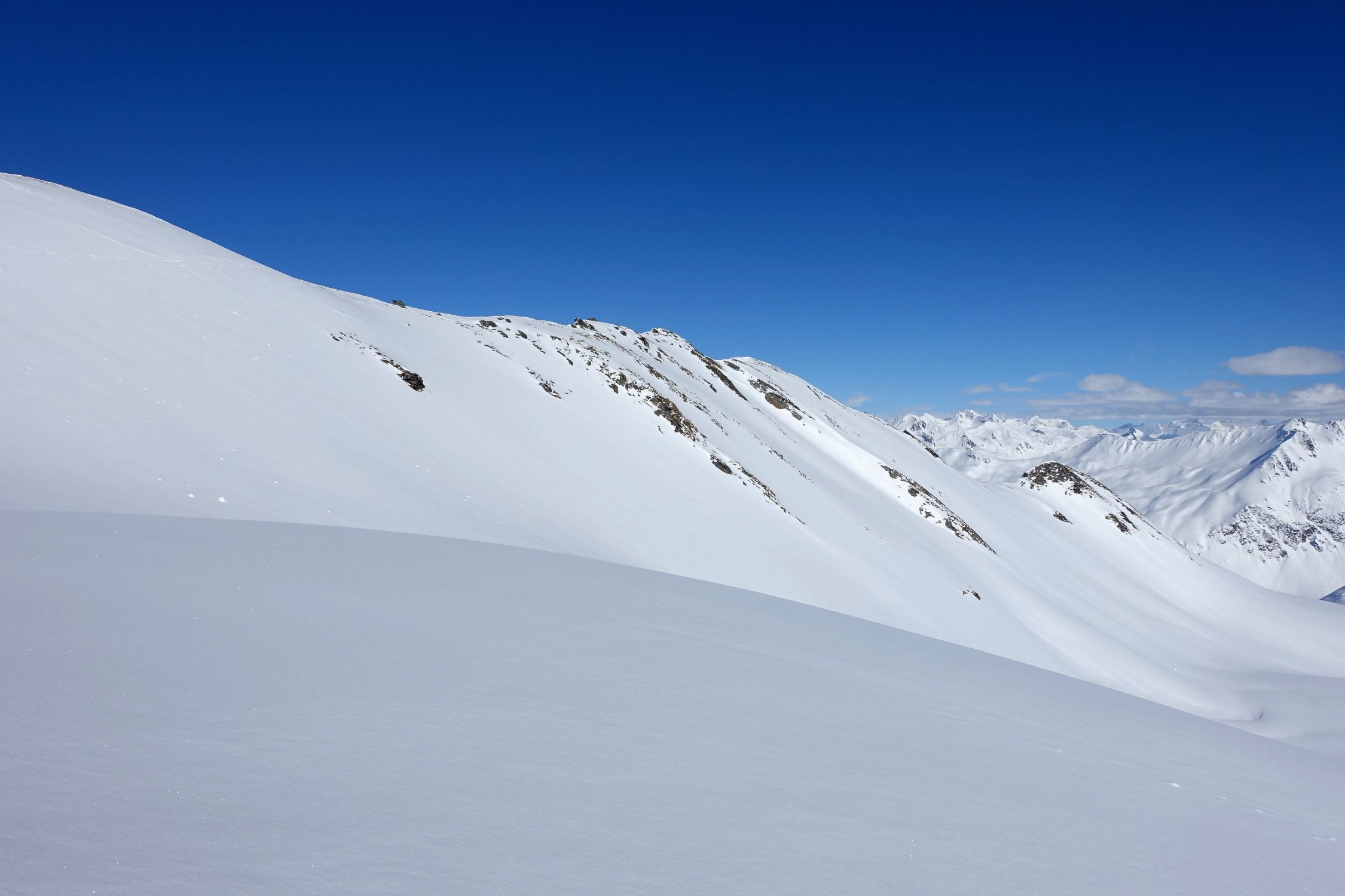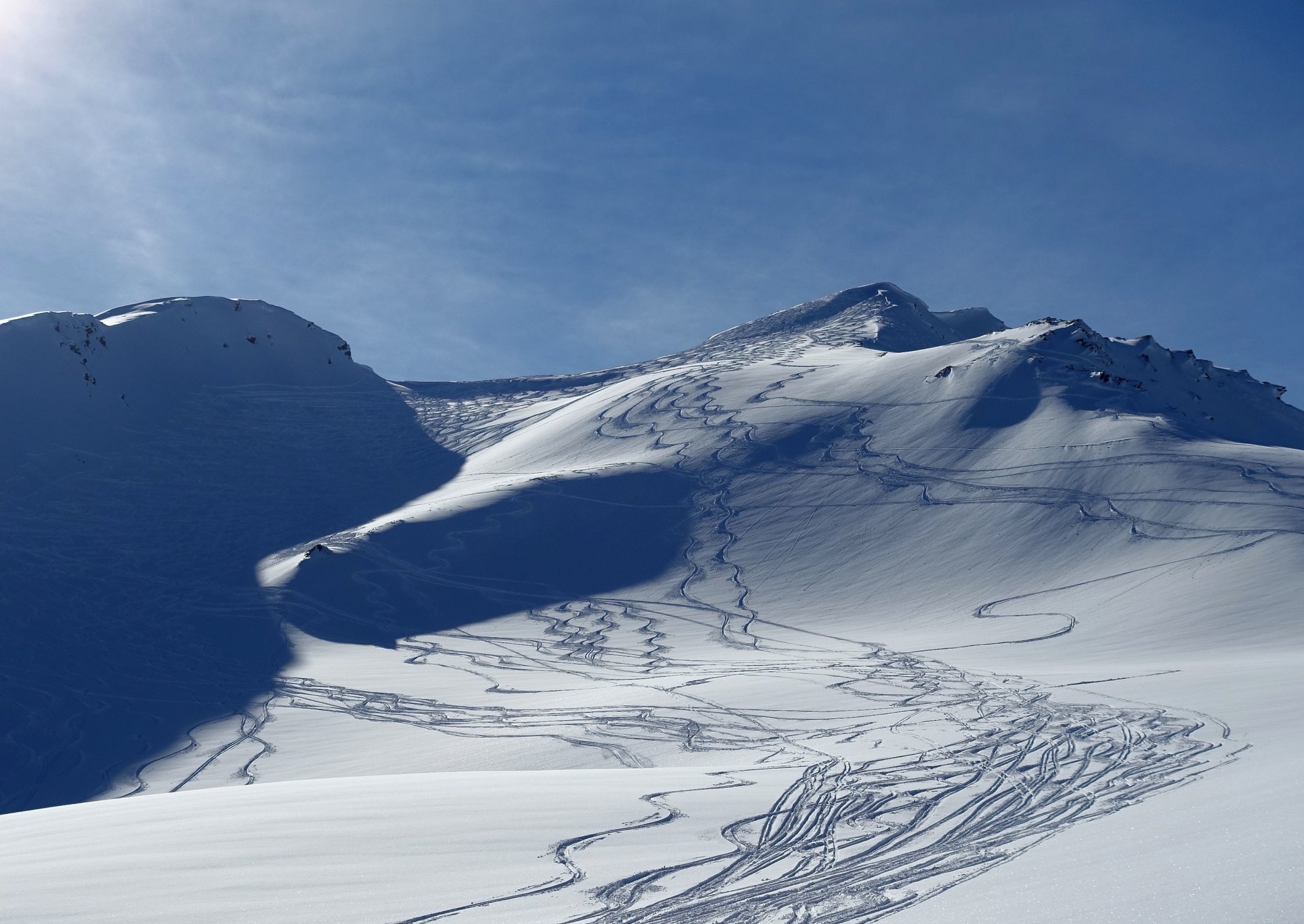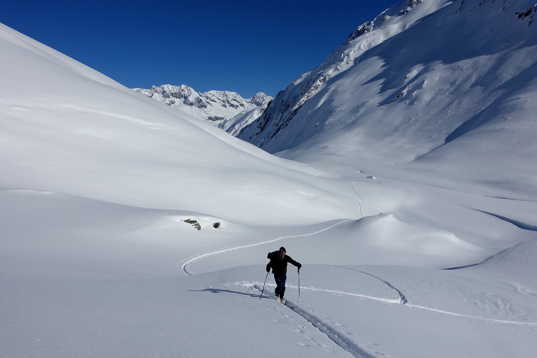 Top Wetter und herrlicher Pulverschnee auf der ganzen Route! Die Querung vom Leckipass zum Skidepot schien mir heute aber infolge sehr viel Triebschnee zu heikel, so dass wir auf den Gipfelaufstieg verzichteten. Dass spontane Schneebretter im Gebiet abgehen konnten, siehe die Bilder.