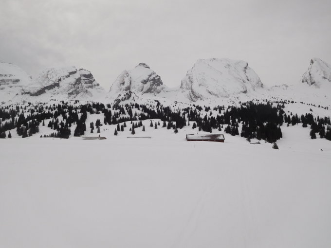 6.40 Uhr bei Hummersboden über Vordere Rossweid,Engi auf Route 811. Föhnsturm ab Selamatt zunehmend am Brisirücken bis unterhalb Gipfel - am Gipfel windstill.